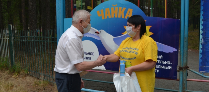 Как известно, на территории всех загородных лагерей соблюдаются санитарные требования, введенные в целях профилактики распространения коронавирусной инфекции. Поэтому встретиться и пообщаться с ребятами Владимиру Федоровичу не удалось. Директору МУ ДОД ДООЦ «Чайка» Анне Сусловой он передал профсоюзную атрибутику (майки, буклеты, трудовые кодексы в картинках и т.д.), которая доступно объясняет мальчишкам и девчонкам суть работы этого общественного объединения.
