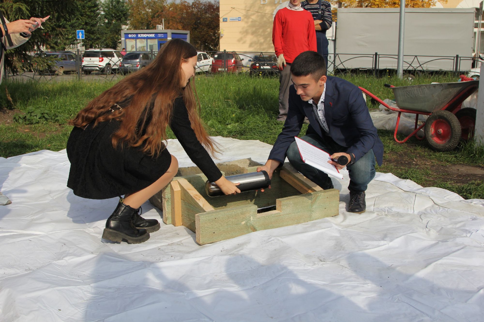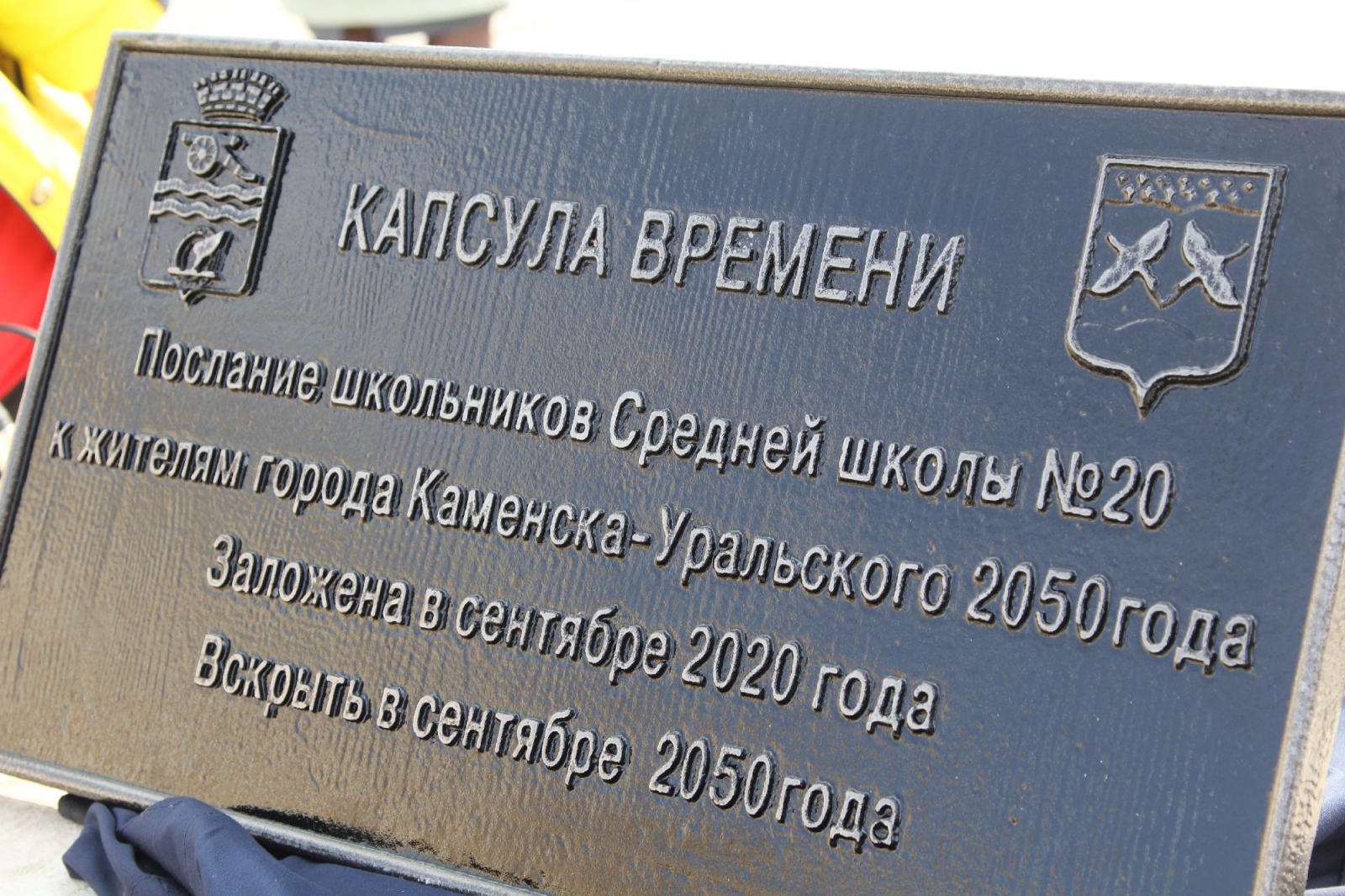 Под звуки фанфар молодежные лидеры школы Глеб Крикун и Полина Парфенова заложили капсулу в специальную нишу возле фонтана. А глава города Алексей Шмыков и Виктор Якимов, замминистра Андрей Кислицын и депутат городской думы Александр Кукарин сообща скрепили фундамент капсулы времени, которую грядущие поколения каменцев прочтут в 2050 году.
