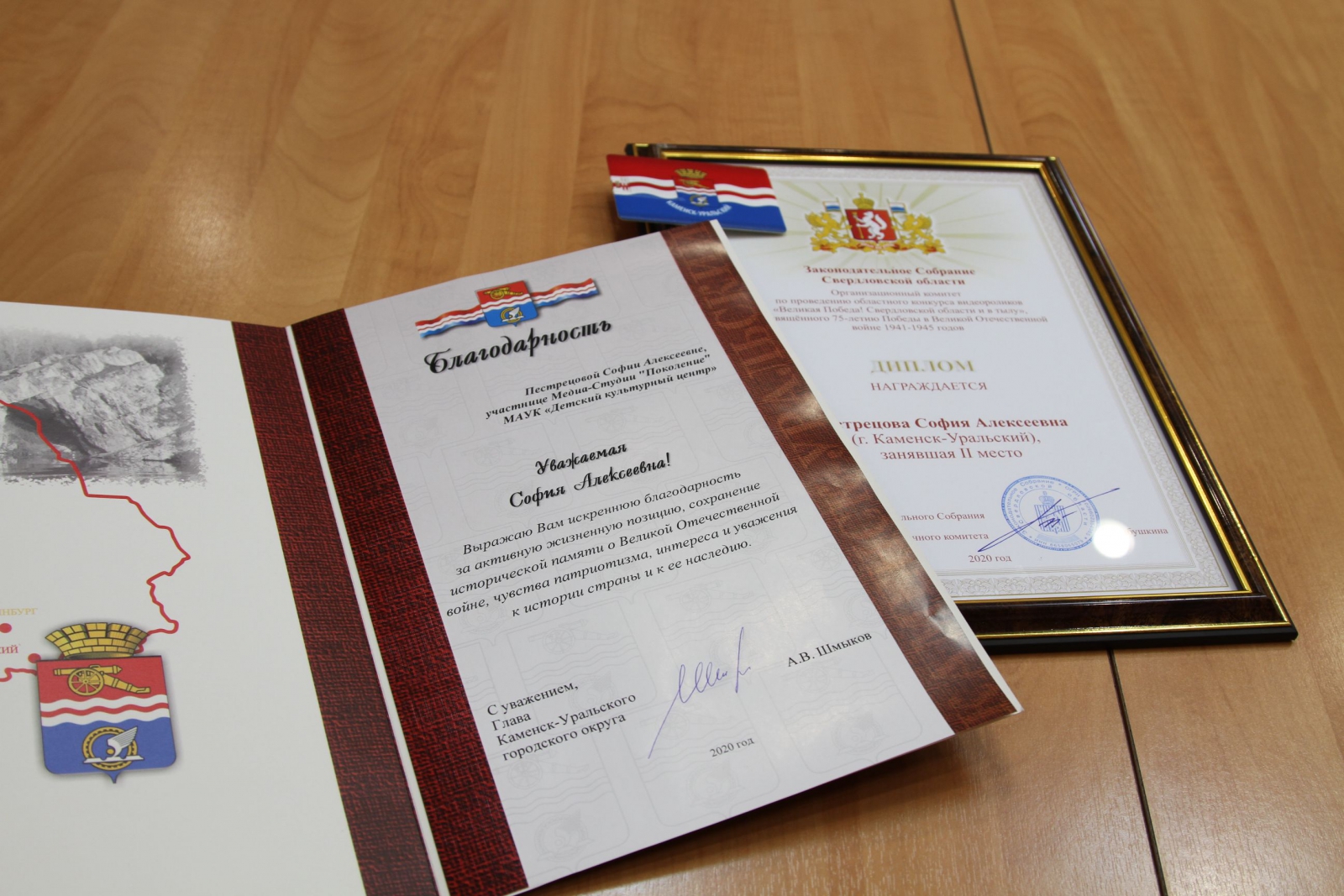 Трехминутный фильм «Каменск героический» занял второе место в областном конкурсе видеороликов, который Законодательное Собрание региона провело в честь 75-летия Победы в Великой Отечественной войне. Автора-призера Софию Пестрецову поздравили заместитель председателя регионального парламента Виктор Якимов и глава города Алексей Шмыков.