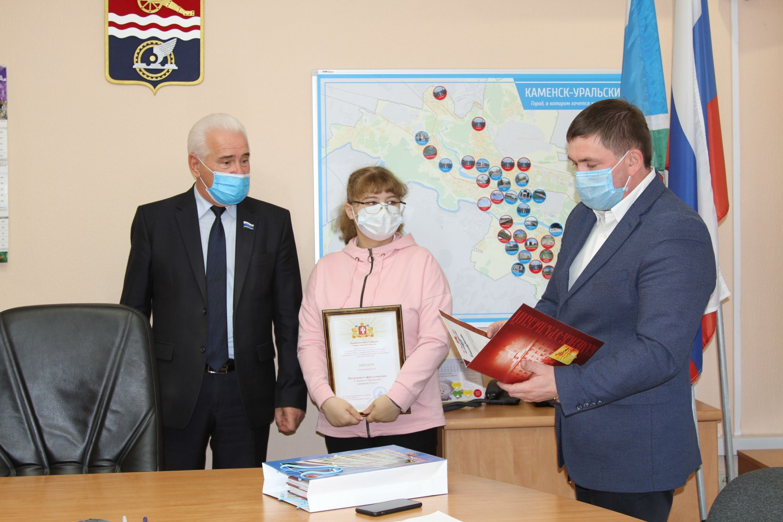 Глава города поблагодарил Софию Пестрецову за победную работу и вручил благодарственное письмо, а также книги о подвиге Каменска в Великой Отечественной войне.
