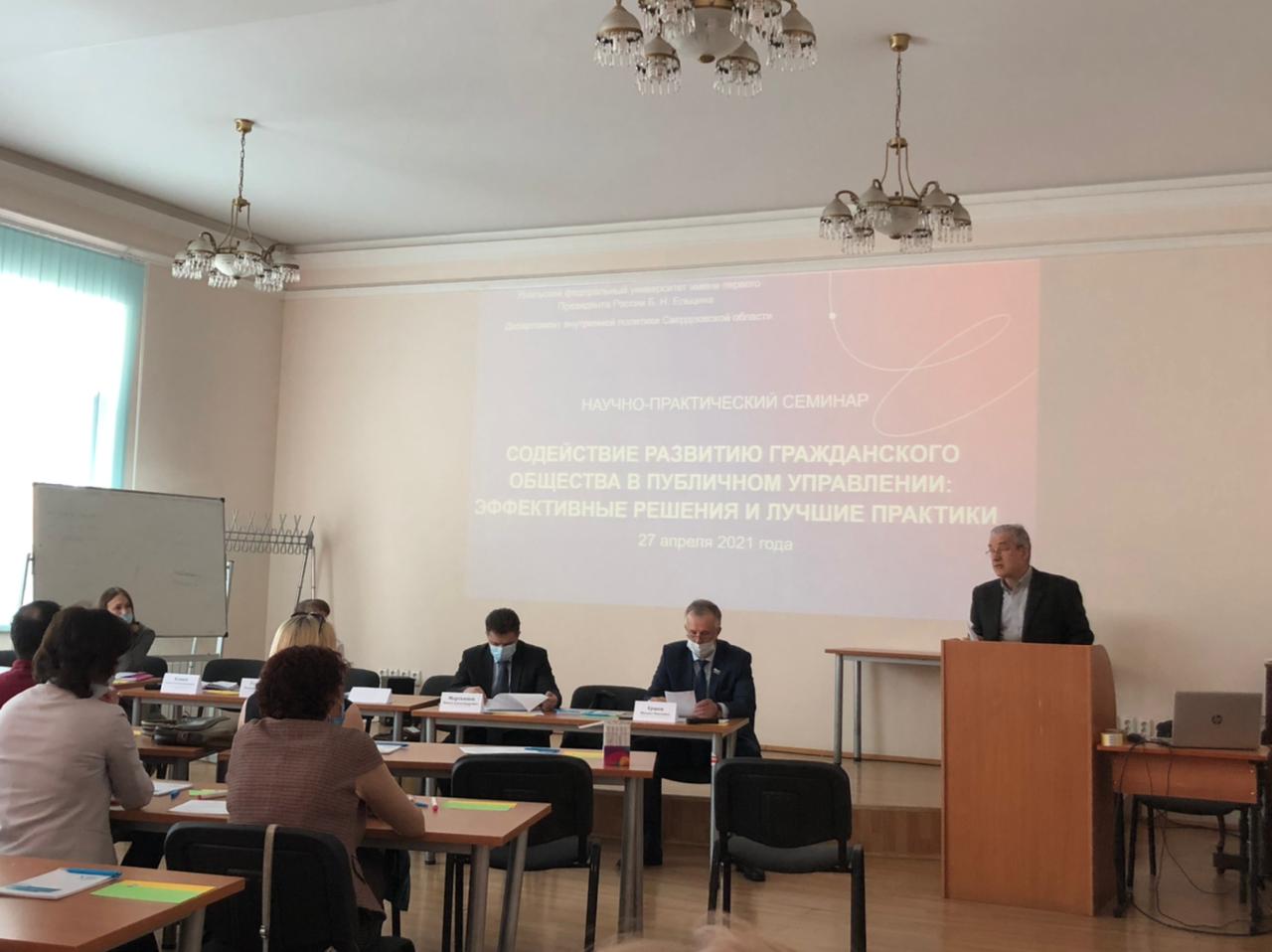 27 апреля, при поддержке Департамента внутренней политики Свердловской области, на площадке Уральского федерального университета имени первого Президента России Б.Н.Ельцина, прошел научно-практический семинар на тему «Содействие развитию гражданского общества в публичном управлении: эффективные решения и практики».