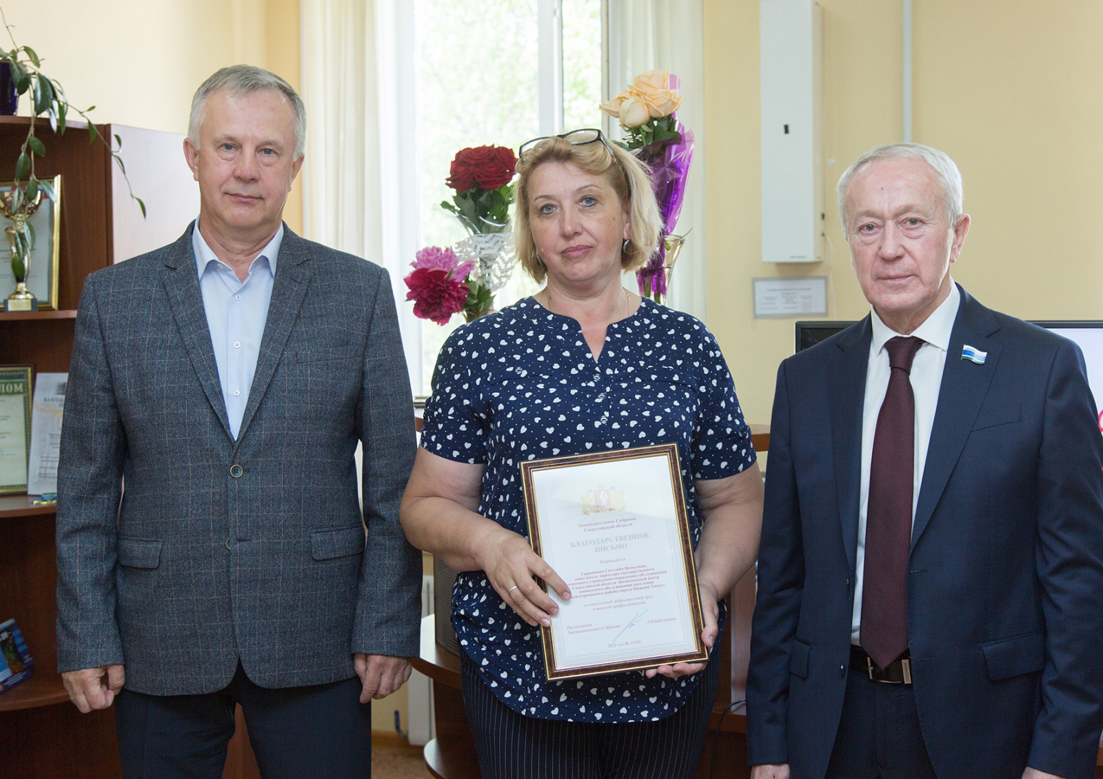 Председатель комитета Законодательного Собрания по региональной политике и развитию местного самоуправления Михаил Ершов и председатель комитета Законодательного Собрания по социальной политике Вячеслав Погудин посетили Управление социальной политики по городу Нижний Тагил и Пригородному району, где в тожественной обстановке поздравили коллектив управления, и лично начальника управления Ларису Пануш, с их профессиональным праздником – Днём социального работника. Депутаты вручили наиболее отличившимся работникам Благодарственные письма и Почетную грамоту Законодательного Собрания Свердловской области.