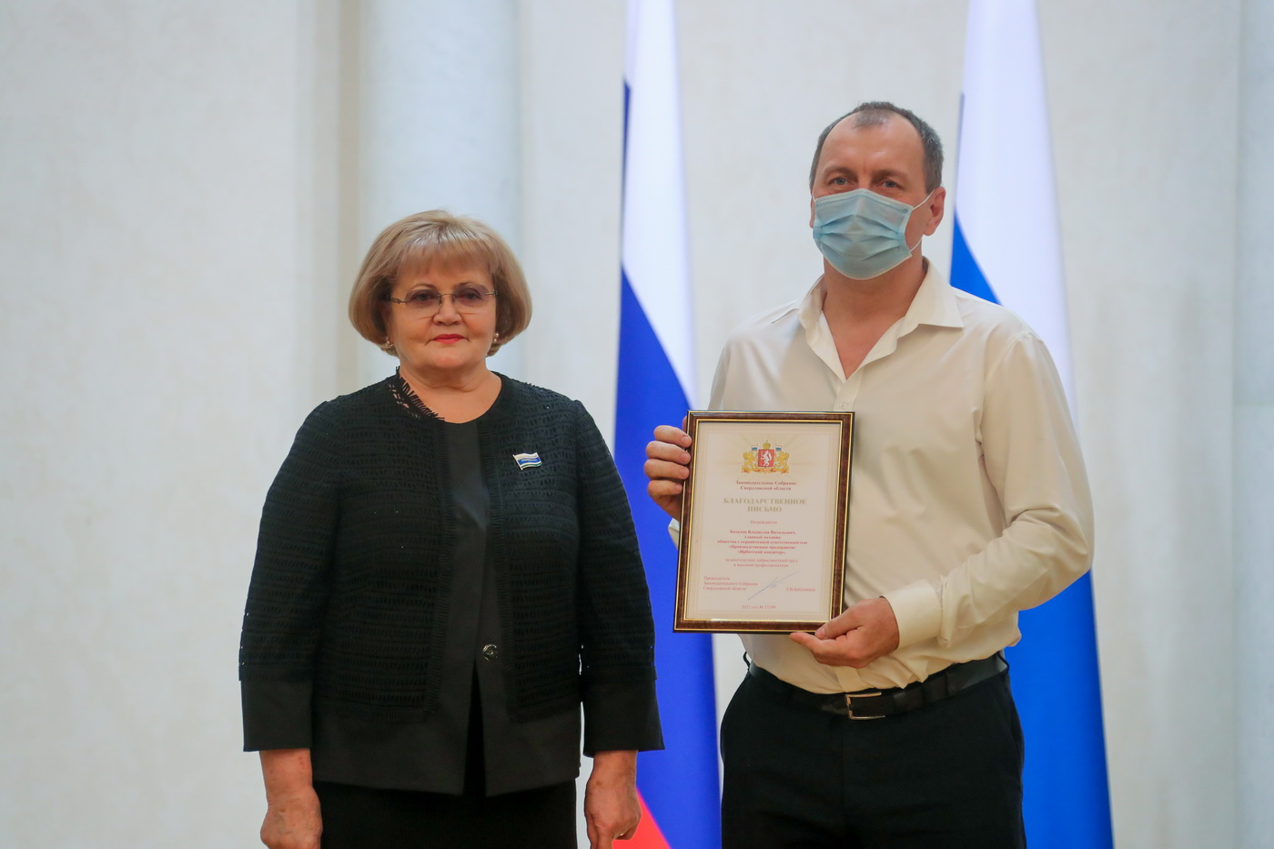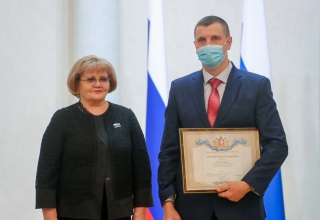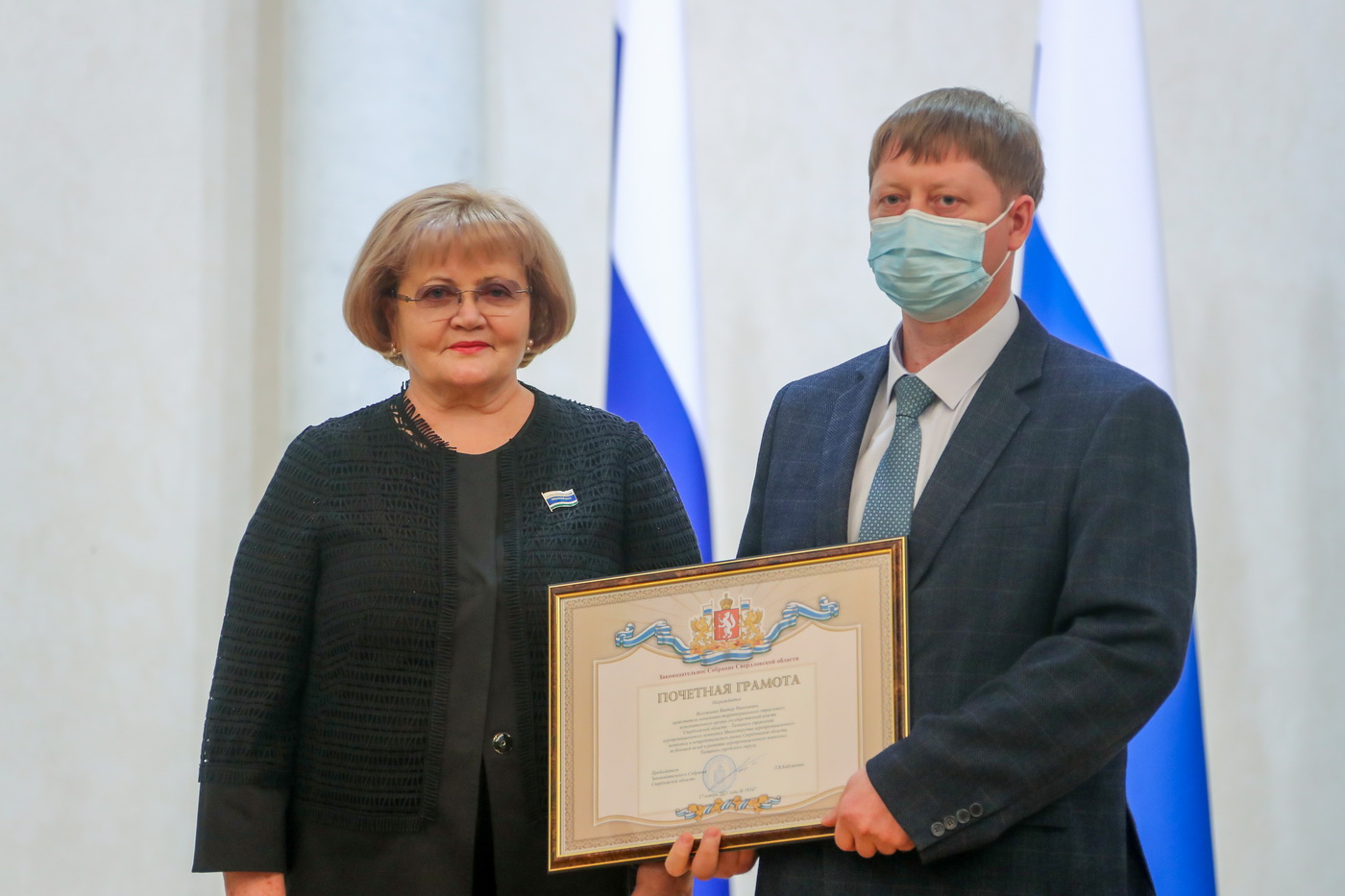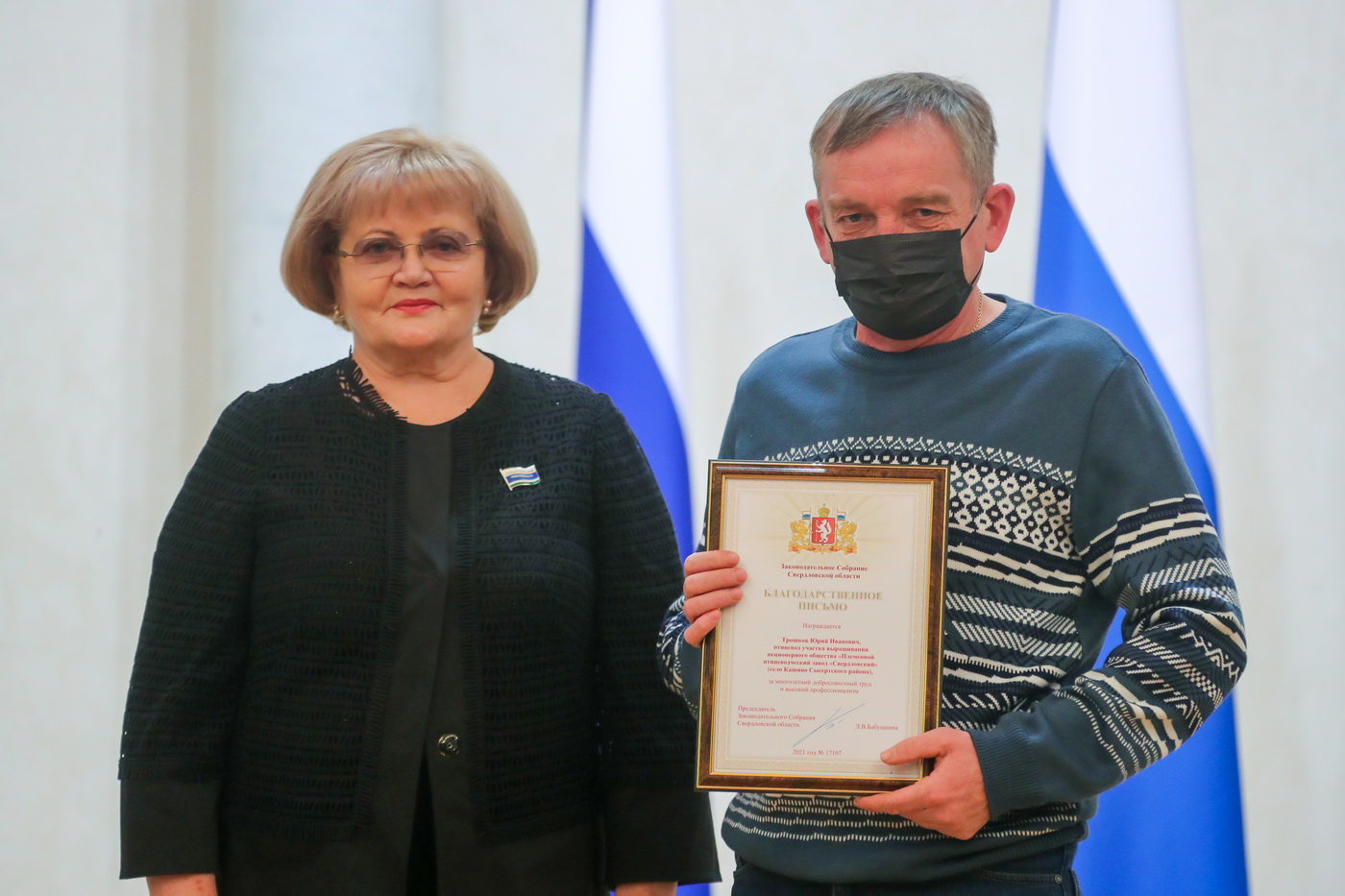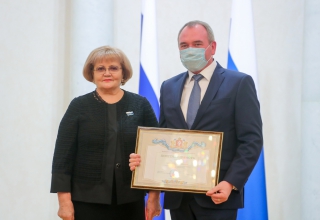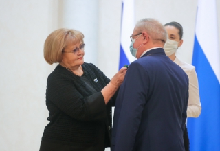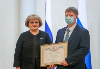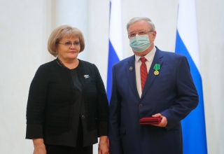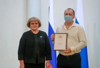 Людмила Бабушкина вручила государственную награду - медаль «За труды по сельскому хозяйству» генеральному директору акционерного общества «Уралплемцентр» Владимиру Мымрину, а также Почетную грамоту и Благодарственные письма Законодательного Собрания наиболее отличившимся работникам сельскохозяйственной отрасли.