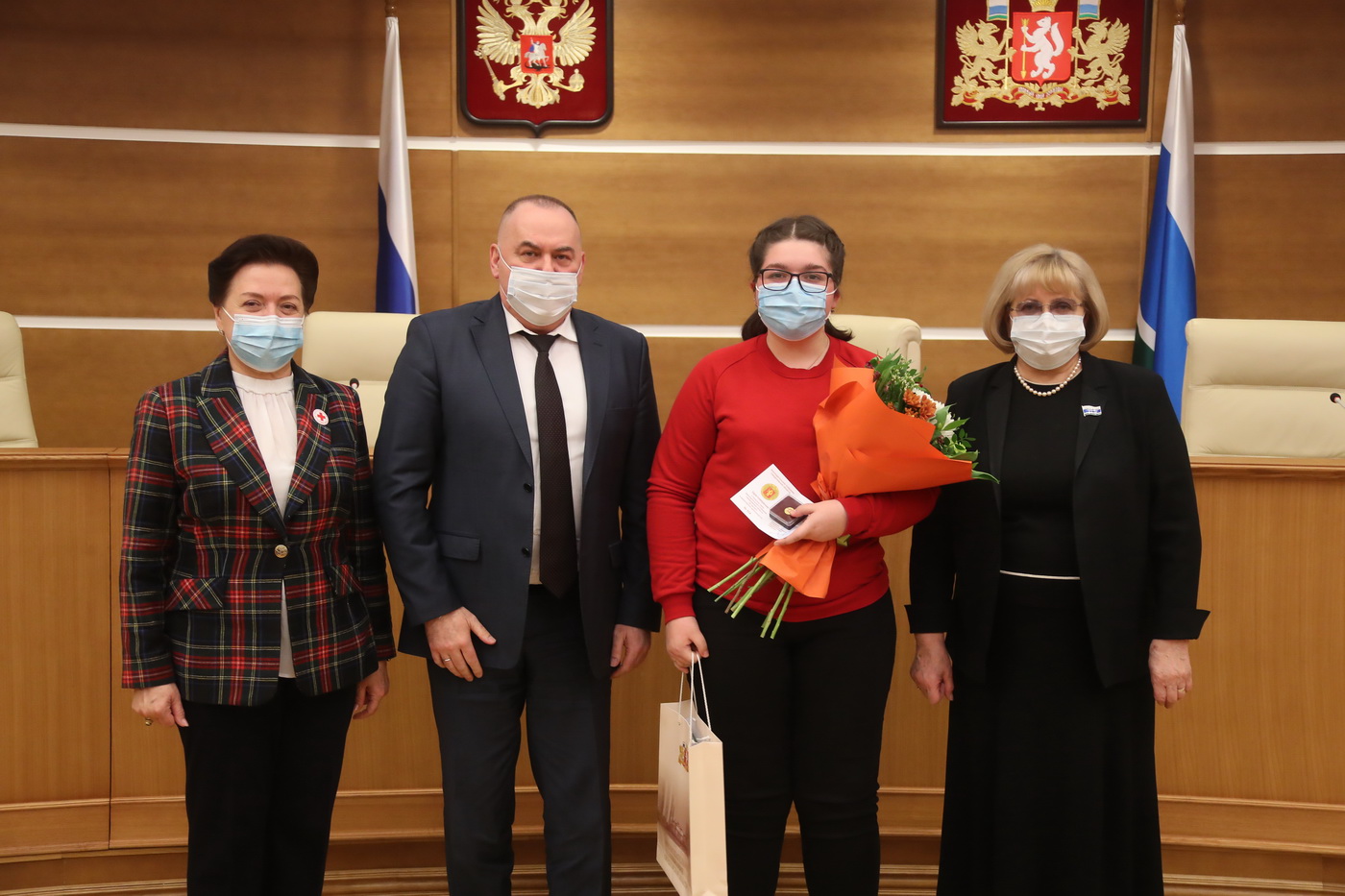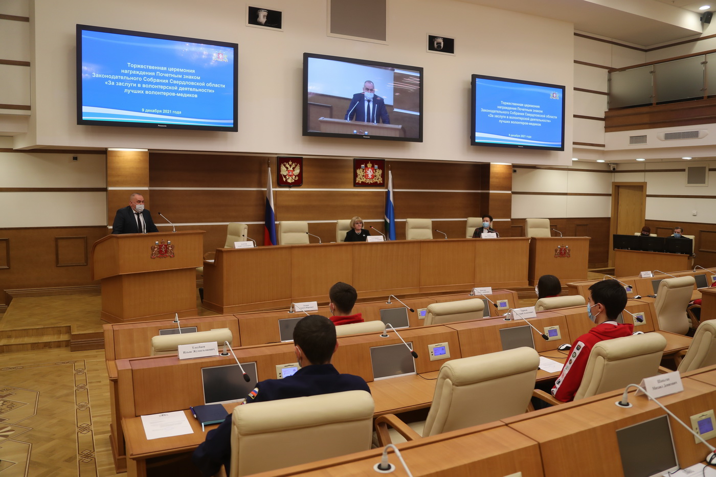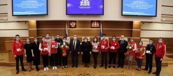 В региональном парламенте состоялась церемония вручения Почетного знака Законодательного Собрания Свердловской области «За заслуги в волонтерской деятельности». В этом торжественном мероприятии приняли участие председатель Законодательного Собрания Людмила Бабушкина, заместитель председателя Законодательного Собрания Виктор Якимов, председатели профильных комитетов, комиссий и депутаты Законодательного Собрания, министр здравоохранения Свердловской области Андрей Карлов, директор ГБПОУ «Свердловский областной медицинский колледж» Ирина Лёвина.