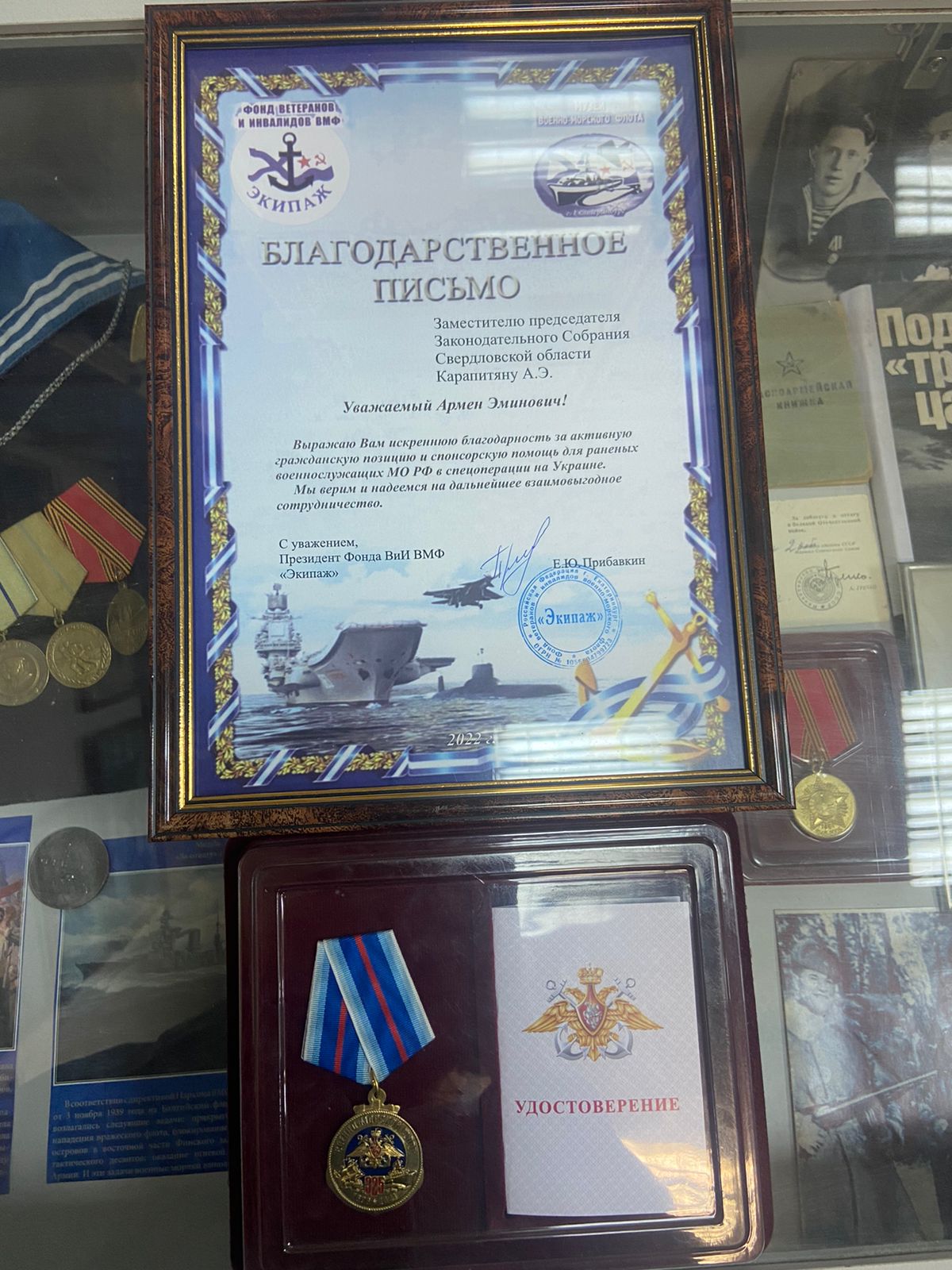 По окончании визита А.Э. Карапетяну было вручено Благодарственное письмо Президента Фонда ветеранов и инвалидов ВМФ «Экипаж» Е.Ю.Прибавкиным за гражданскую позицию и спонсорскую помощь для раненых военнослужащих МО РФ в спецоперации на Украине и памятную медаль.