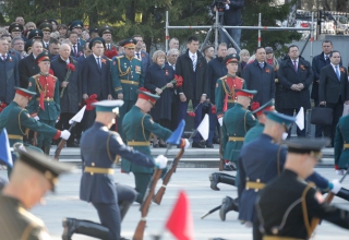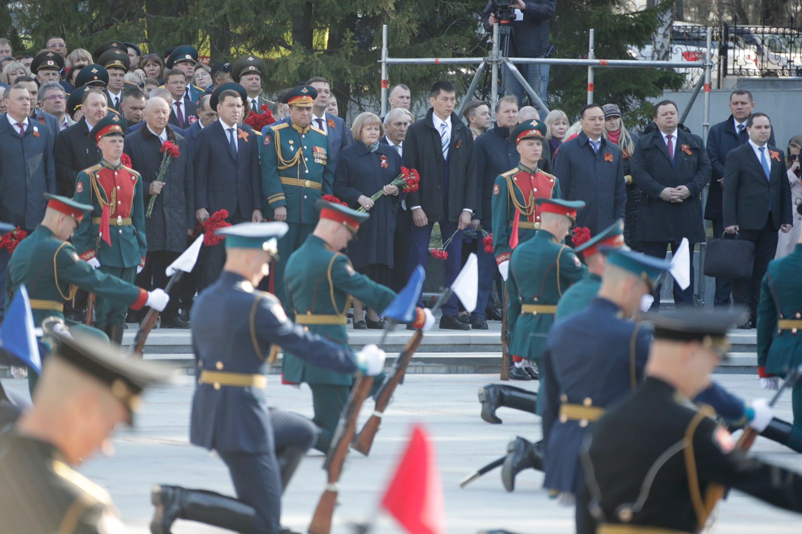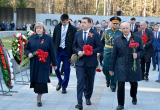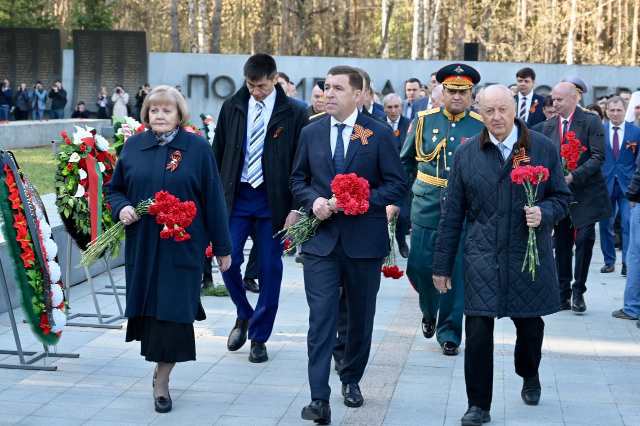 Цветы и венки к Вечному огню возложили заместитель Полномочного представителя Президента РФ в УрФО Борис Кириллов, губернатор Свердловской области Евгений Куйвашев, председатель Законодательного Собрания Людмила Бабушкина, митрополит Екатеринбургский и Верхотурский Евгений, врио командующего войсками Центрального военного округа Рустам Миннекаев, глава Екатеринбурга Алексей Орлов, депутаты регионального парламента, члены областного кабинета министров, представители дипломатических миссий, религиозных конфессий, общественных организаций региона.