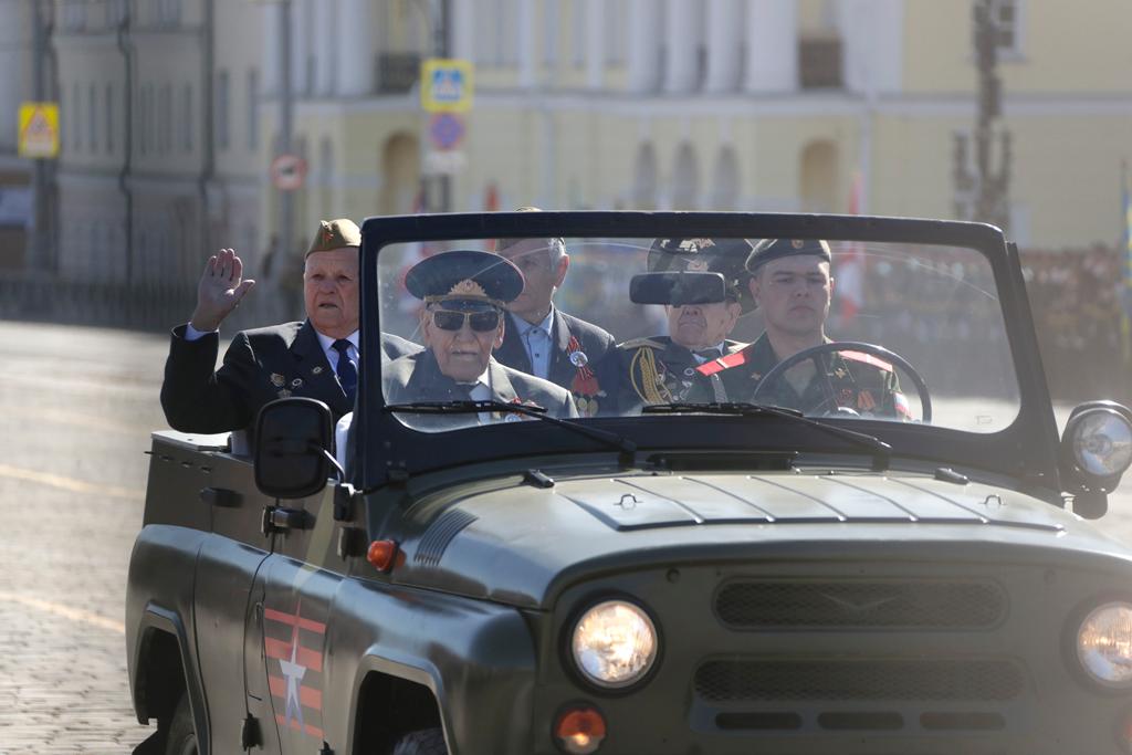 Ветераны Великой Отечественной войны прибыли на парад в специальной автоколонне. Копию знамени Победы провез участник обороны Сталинграда, полковник в отставке Леонид Вильховский, воевавший на Первом и Втором Украинских и на Прибалтийском фронтах.
