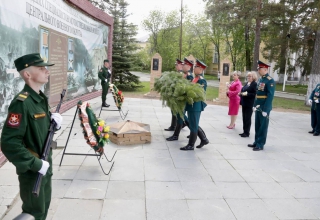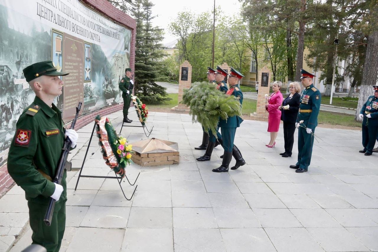 В рамках юбилейных торжеств состоялась церемония возложения цветов к Вечному огню, расположенному на территории Окружного учебного центра.