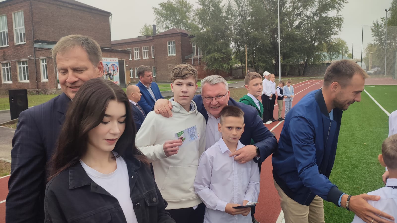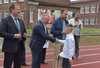 Разрезание красной ленточки... и вот оно, доступное красноуральцам новое спортивное пространство. Здесь и футбольное поле с искусственным покрытием, и баскетбольная универсальная площадка, и беговые дорожки, покрытые полимерным материалом, и подвижные уличные тренажеры. Приятной составляющей праздника в этот день стал товарищеский матч по волейболу между сборными 10 класса и учителей школы, а также символические голы в футбольные ворота в красивом исполнении депутатов Антона Шипулина и Сергея Никонова.
