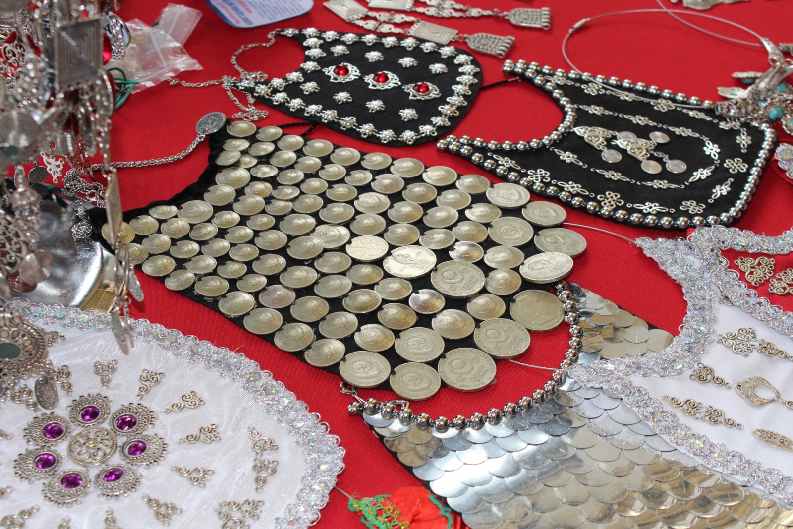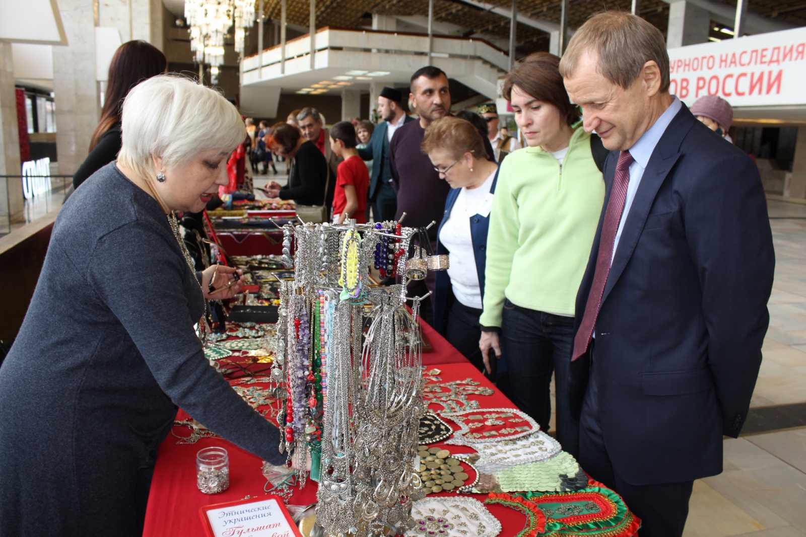 Депутат до концерта посмотрел выставку народных промыслов. Особенно восхитили вышитые национальные наряды и монисто, сделанное из советских монет.