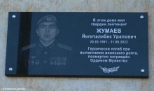 Мероприятия состоялись 9 декабря в День Героев Отечества в Асбесте. Йигиталибек Уралович Жумаев, гвардии лейтенант 56-ой Отдельной гвардейской десантно-штурмовой ордена Отечественной войны I степени Донской казачьей бригады воздушно-десантных войск России погиб при исполнении воинского долга 31 августа 2022 года. Он награжден боевыми и правительственными наградами, в том числе медаль Суворова, медали «За боевые отличия», «За отличие в военной службе» III степени, «За отвагу». Посмертно удостоен Ордена Святого Георгия. Асбестовцы увековечили память земляка, установив мемориальные доски на доме, где он жил и в школе, где учился.