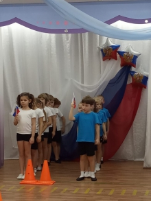 Соревновались четыре команды по восемь детей из подготовительных групп. Речевки, девизы, строевые приемы, бросание игрушечных гранат в корзины – все это проходило весело и с задором. Каждый участник веселых стартов заслужил сладкий подарок. Состязания в ловкости и строевой выучке проходили на фоне российской атрибутики, что придало детскому празднику особую значимость.
