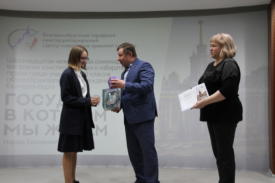 Момент награждения всегда самый приятный и волнующий. Депутатский центр Сергея Мелехина предоставил три комплекта станции мини «Алиса» для вручения победителям олимпиады Елене Дедюлиной, Надежде Каргиной, Марии Устиновой. Восемнадцать финалистов и призеров были награждены дипломами и благодарственными письмами Екатеринбургского городского межтерриториального Центра повышения правовой культуры с подарочными сертификатами.