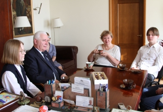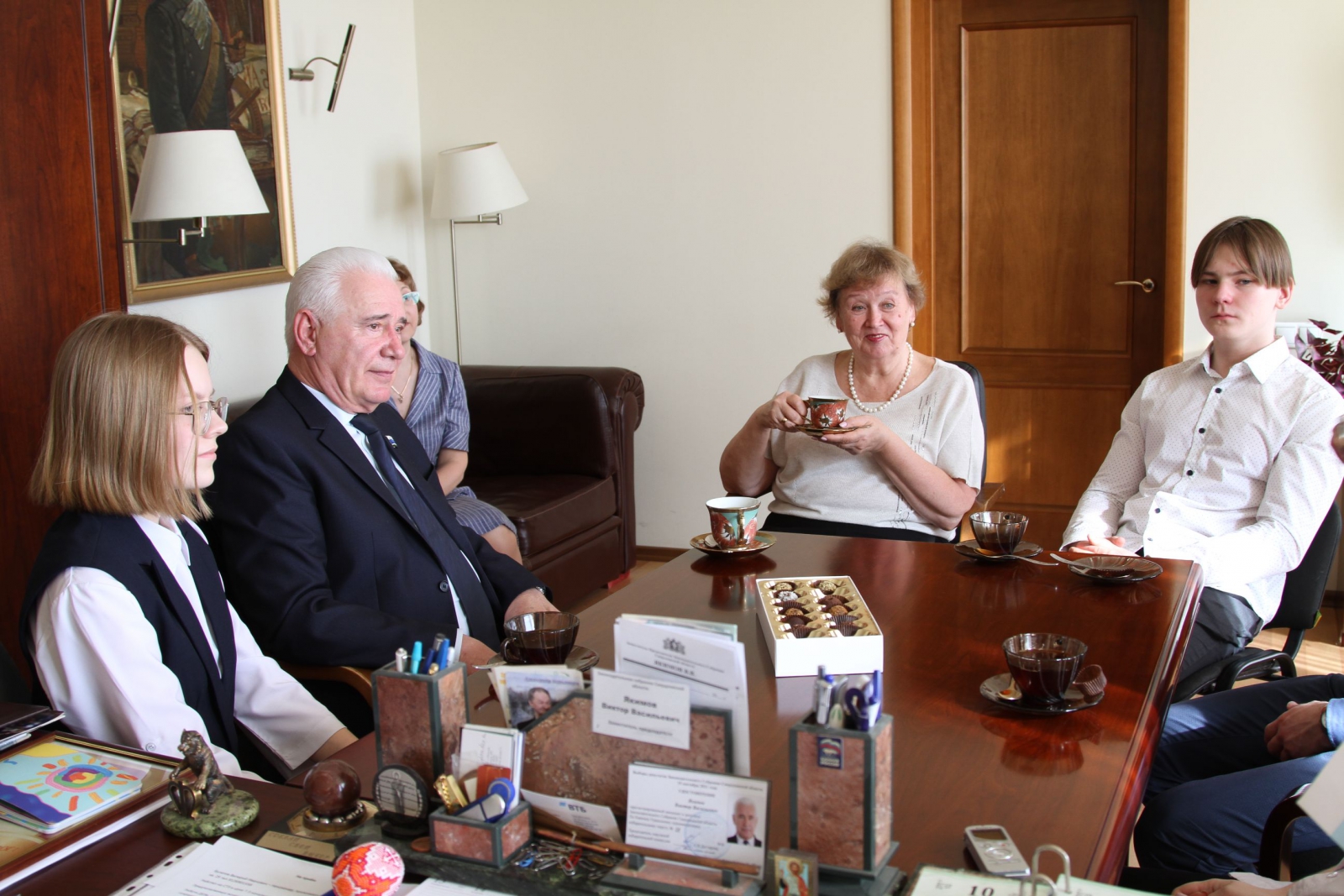 После завершения видеосъемки разговор в кабинете парламентария перешел в неофициальный формат. На столе появились чай и конфеты, а диалог сместился в сторону интересов старшеклассников и школьных новостей. Ребята поделились с Виктором Якимовым, кем планируют стать после школы и о чем мечтают. А на прощанье пригласили вице-спикера в школу, в центр детских инициатив и сделали коллективный снимок.