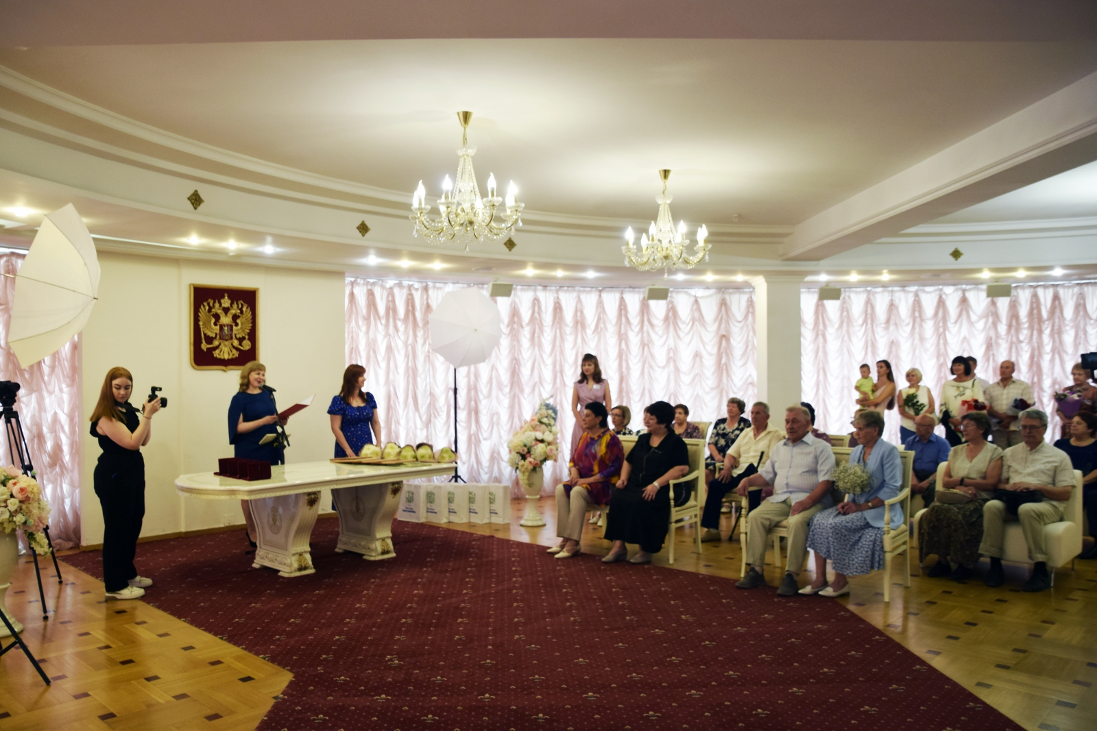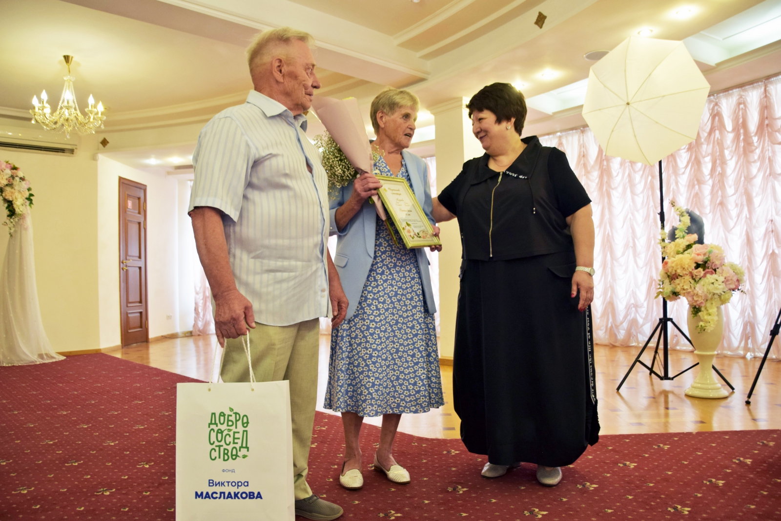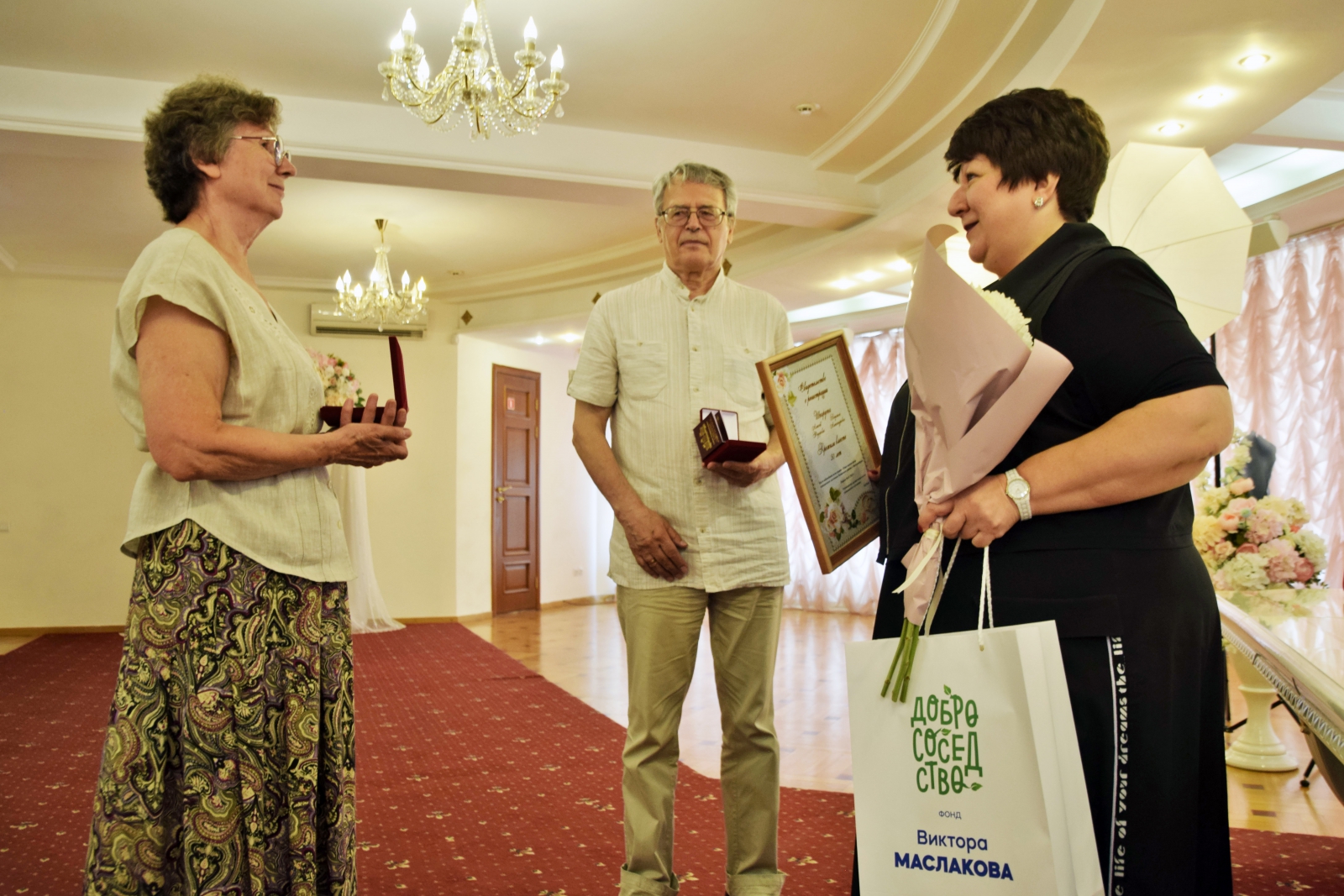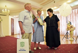 Знаки отличия «Совет да любовь» в этот день получили Алексей Федорович и Людмила Александровна Шпарута, Виктор Тимофеевич и Анастасия Васильевна Торговановы, Юрий Михайлович и Галина Владимировна Подкорытовы, Николай Александрович и Мария Николаевна Пироговы, а также Игорь Дмитриевич и Галина Васильевна Казаковы – отметившие «бриллиантовую» свадьбу, 60-летний юбилей своего брака.