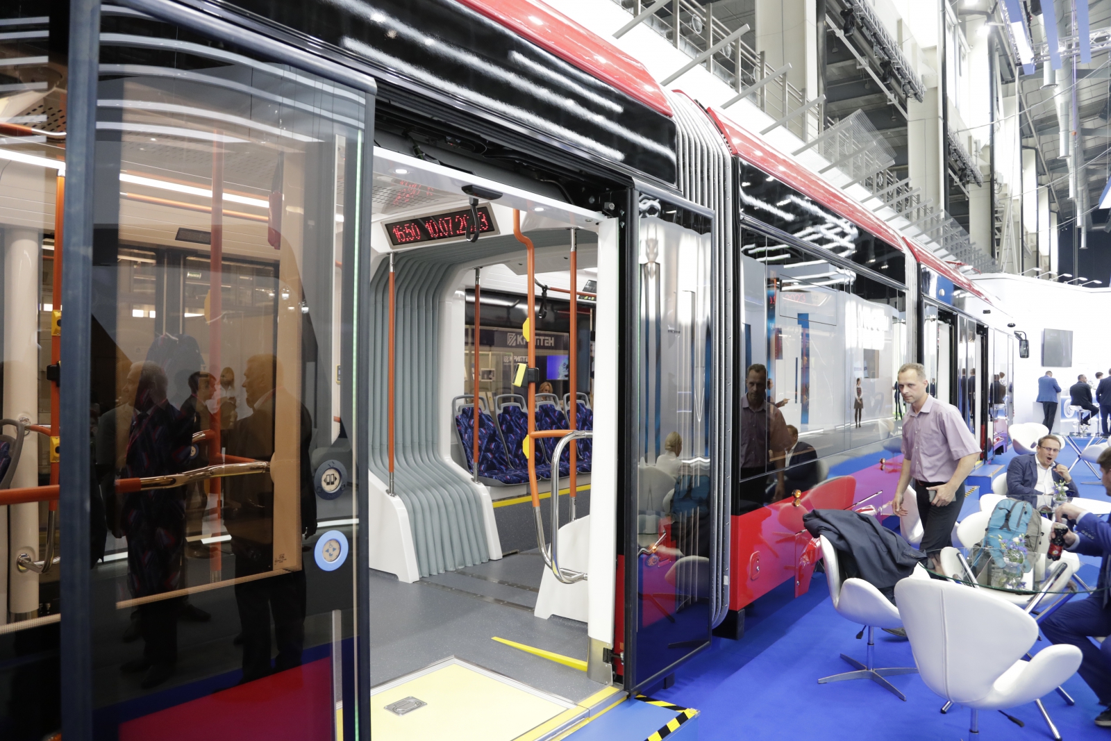В ходе посещения выставочных стендов депутаты уделили особое внимание новинкам городского транспорта. В частности, парламентарии осмотрели произведенный «ПК Транспортные системы» трехсекционный, низкопольный трамвайный вагон серии 71-932 «Невский». Просторный салон этого трамвая рассчитан на 52 сидячих места. «Невский» специально сконструирован так, чтобы у пассажиров была возможность в максимально комфортных условиях любоваться красотой города: вагон оснащен панорамным остеклением и усовершенствованной системой климат-контроля.