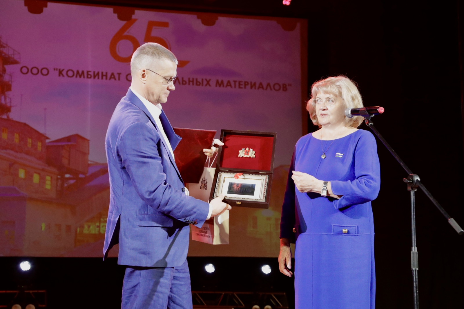 Председатель парламента вручила памятный подарок и Благодарственное письмо Законодательного Собрания Свердловской области генеральному директору комбината Владиславу Чераневу, а лучшие работники предприятия также были удостоены наград Законодательного Собрания Свердловской области.