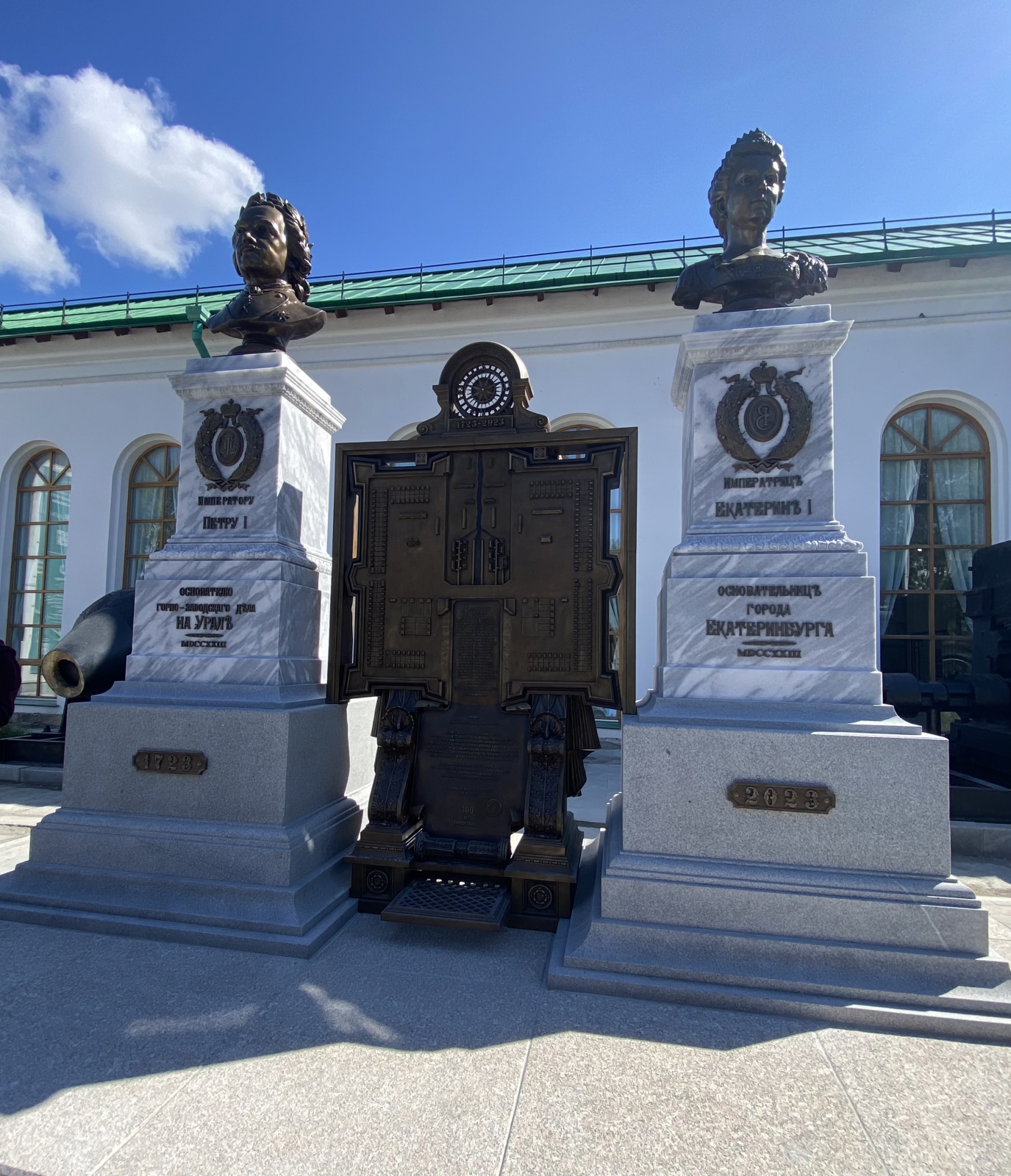 К 300-летию города памятники воссозданы творчеством большого авторского коллектива Уральского архитектурного университета при поддержке городских властей. Как рассказал руководитель и один из авторов проекта, ректор УрГАХУ Александр Долгов, от оригинальных фигур сохранился только постамент, на котором стоял бюст Петра I. В 1992 году по решению Главы Екатеринбурга Аркадия Чернецкого памятник был восстановлен. Сейчас он перемещен в зал музея архитектуры и дизайна, который теперь будет называться Петровским.
