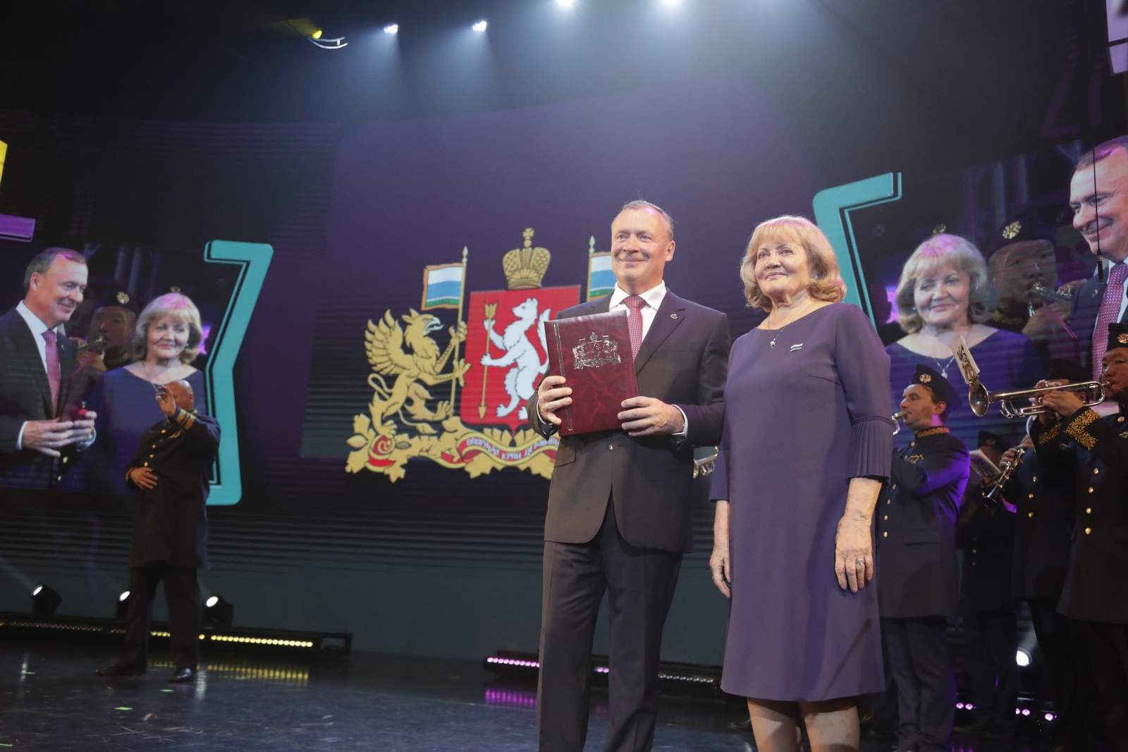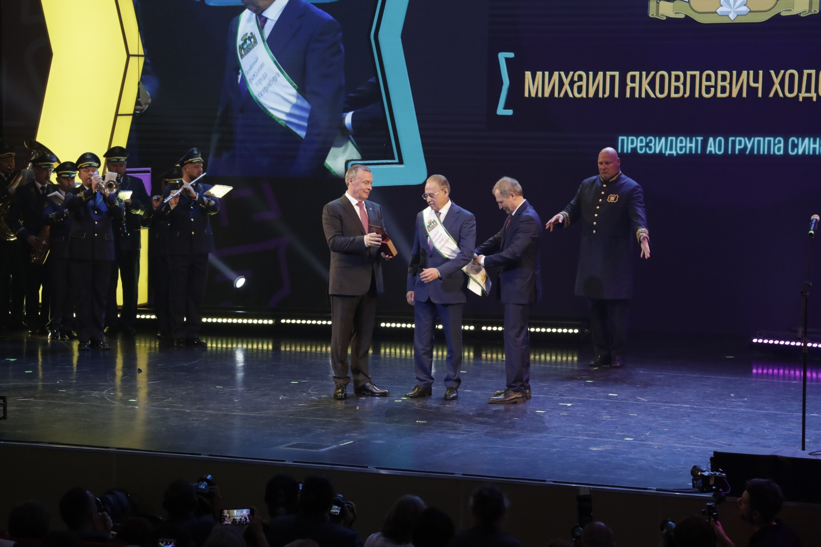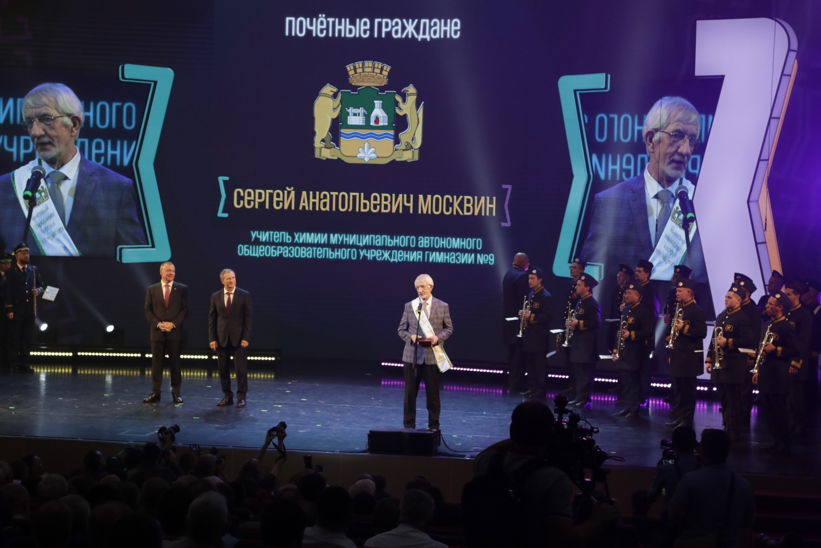 Участники торжественного собрания чествовали новых Почётных граждан города — учителя химии одного из старейших учебных заведений Екатеринбурга — гимназии № 9 Сергея Москвина, генерального директора ОКБ «Новатор» Фарида Абдрахманова, учредителя компании «Сима-Ленд» Андрея Симановского и президента Группы «Синара» Михаила Ходоровского.