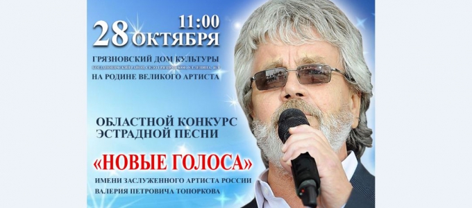 Стартовал прием заявок на Областной конкурс эстрадной песни «Новые голоса» имени заслуженного артиста России Валерия Петровича Топоркова, который пройдет 28 октября 2023 года с 11-00 в селе Грязновском городского округа Богданович.