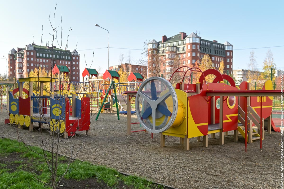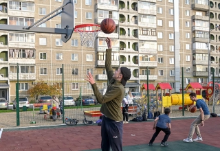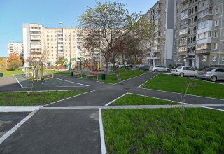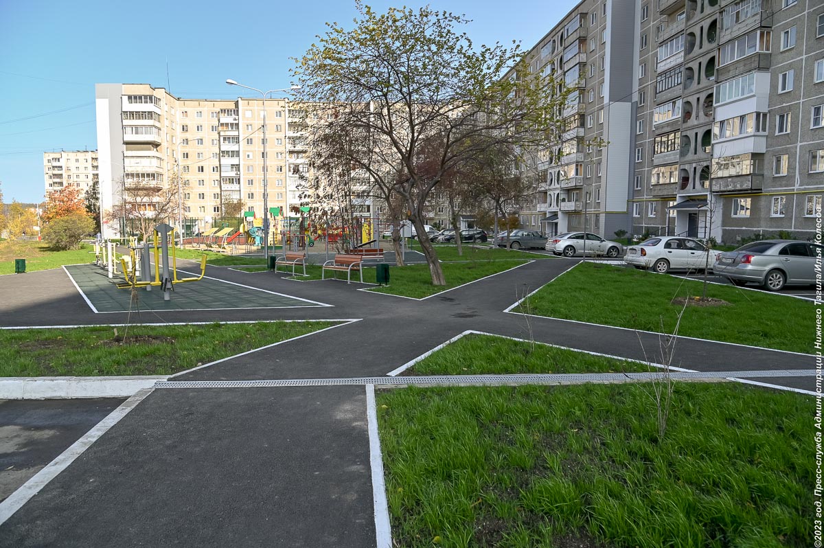 За летние месяцы строители благоустроили более 21 тысячи кв. метров дворовой территории. Заасфальтировали проезды, пешеходные дорожки и парковки, как внутри квартала, так и вокруг дома. Смонтировали систему наружного освещения. За счет уклонов и водостоков решили проблему отвода талой и дождевой воды, которая раньше часто скапливалась во дворе. В центре площадки установили садово-парковые качели, детское и спортивное оборудование, рядом обустроили баскетбольную площадку с резиновым покрытием. Возле подъездов появились лавочки и урны, вдоль транзитных дорожек и в зоне отдыха высадили более 120 новых деревьев.