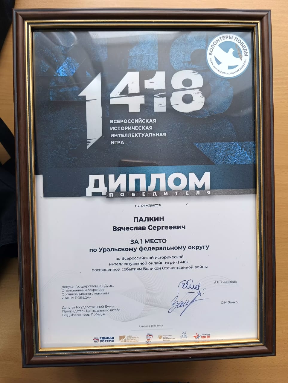 В этом году наилучший результат в самой массовой интеллектуальной исторической онлайн-игре, посвященной событиям Великой Отечественной войны, показала команда «Умный соболь» из г. Невьянска. 25 октября парламентарий специально прибыл в этот город, чтобы лично поздравить старшеклассников из школы №4 с победным результатом.