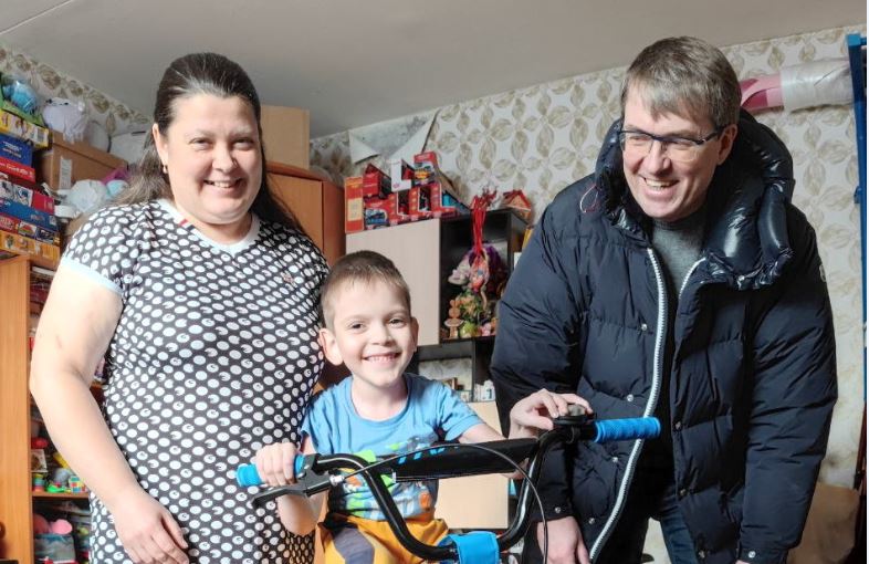 Сереже 7 лет, он с мамой много занимается реабилитацией опорно-двигательного аппарата, делает успехи и много улыбается. О велосипеде мечтал давно, и подарок даже цветом попал в точку.