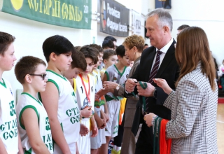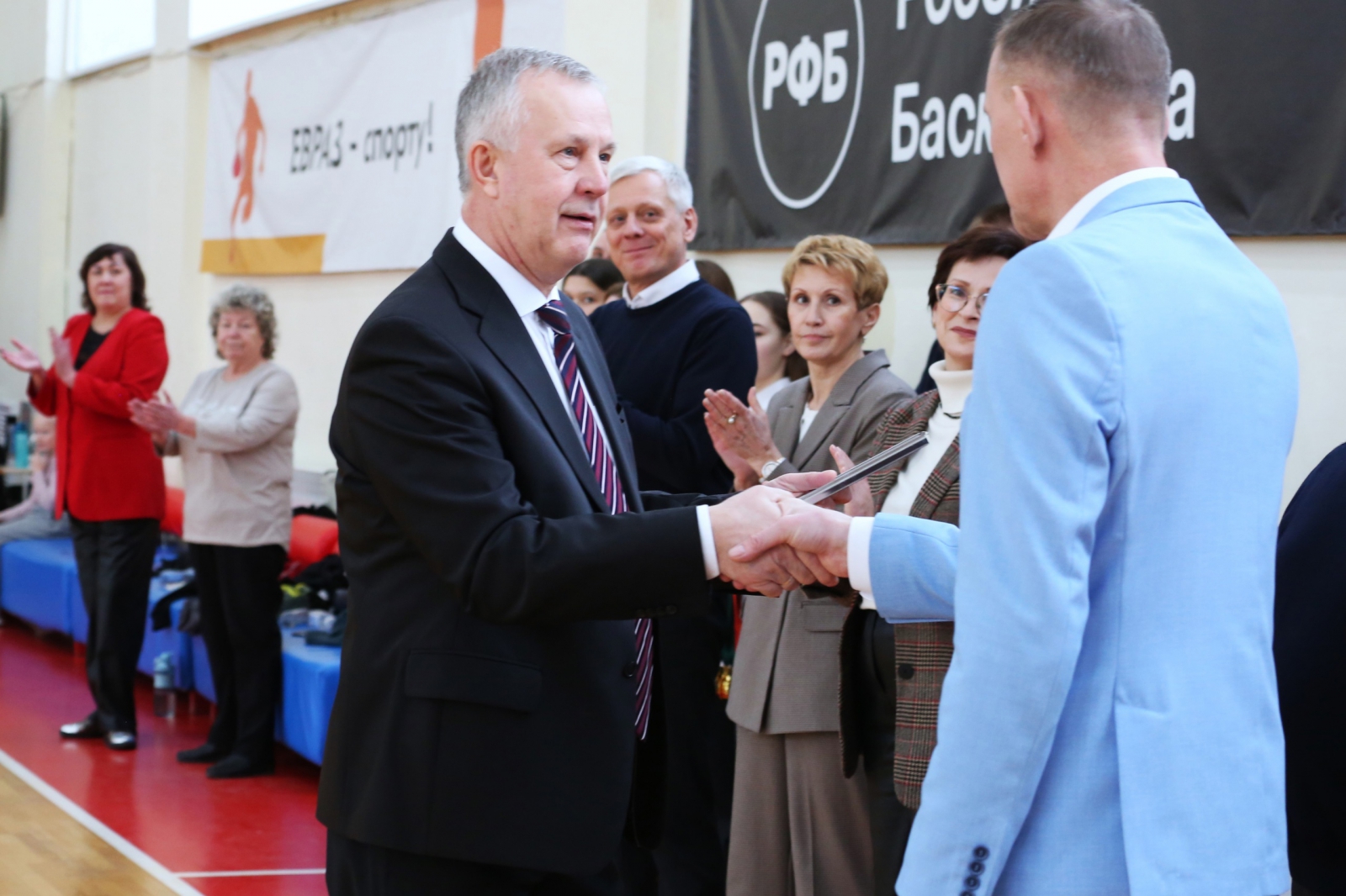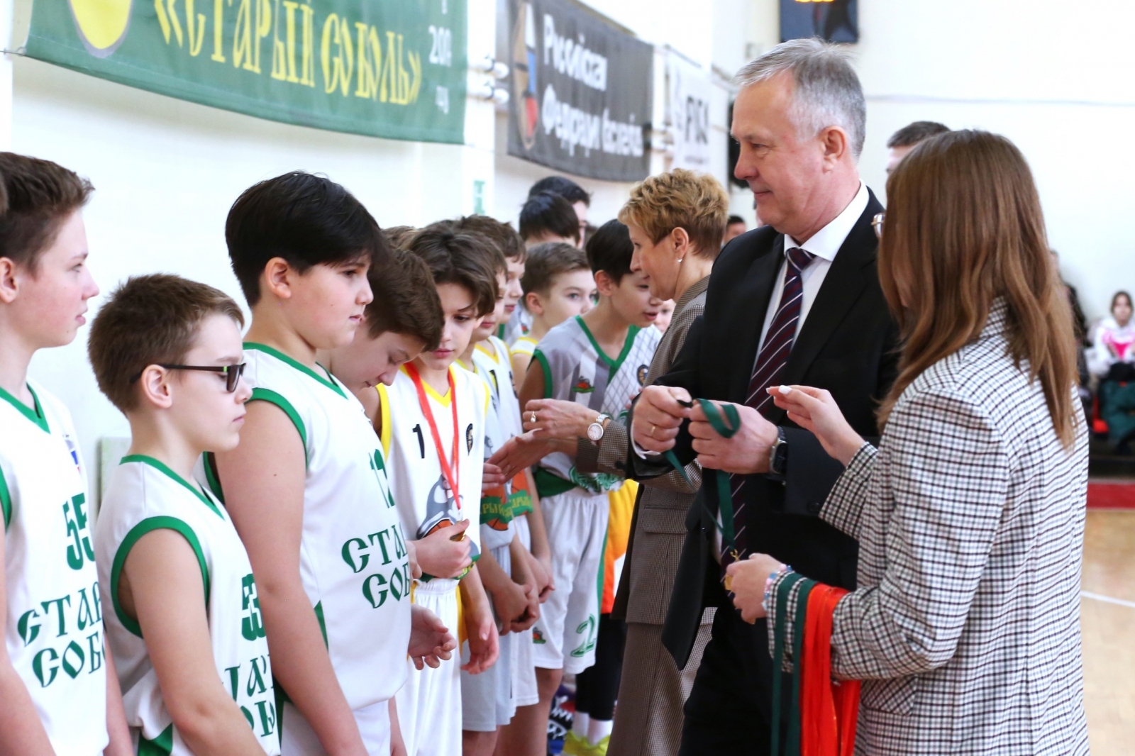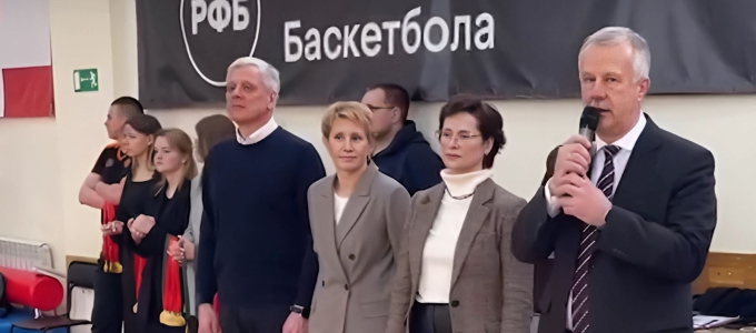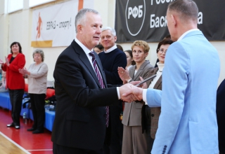 Михаил Ершов вручил награду Российской федерации баскетбола директору школы Игорю Вахрушеву и юбилейные медали спортсменам.