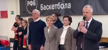 Михаил Ершов вручил награду Российской федерации баскетбола директору школы Игорю Вахрушеву и юбилейные медали спортсменам.