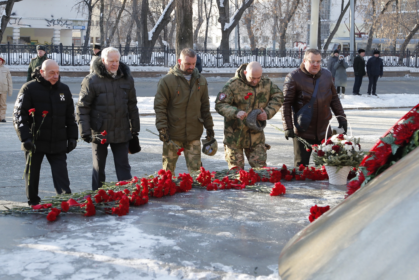 Торжественная церемония возложения цветов к памятнику маршалу Советского Союза Георгию Константиновичу Жукову состоялась в Екатеринбурге в преддверии Дня защитника Отечества.
