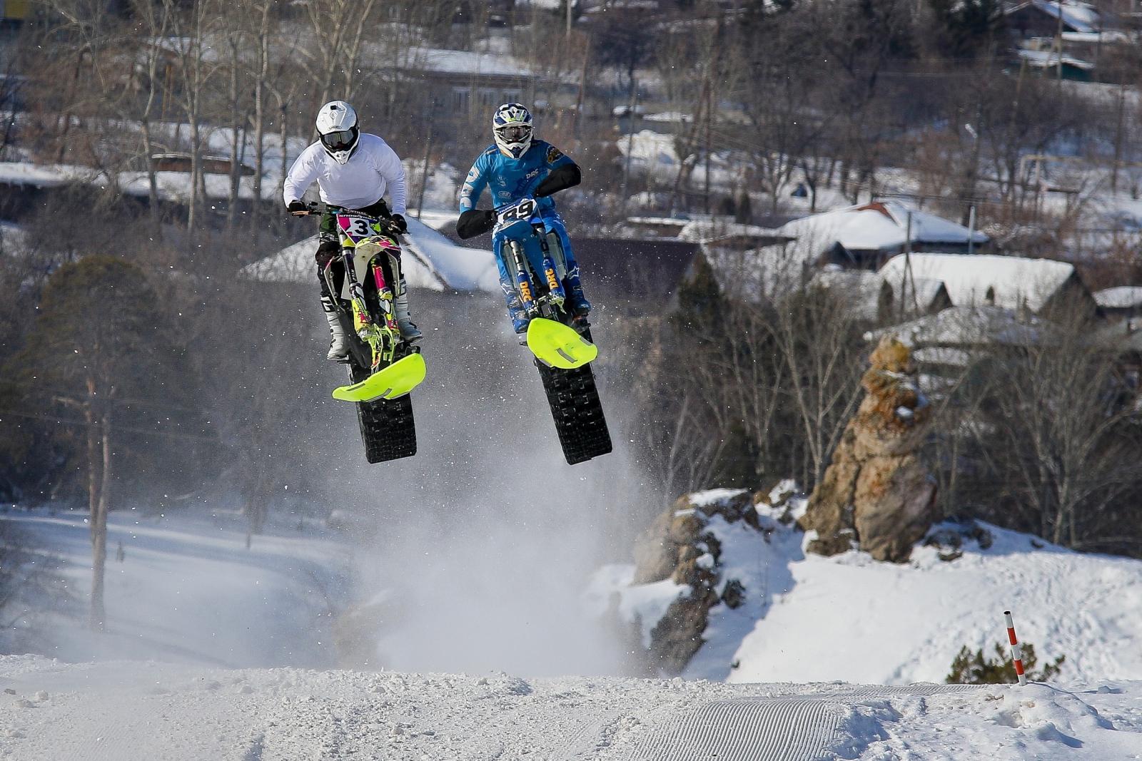 Сноубайки — это практически те же мотоциклы для мотокросса, только переоборудованные для езды по снегу — спереди вместо колеса у байка лыжа, а сзади — гусеница.