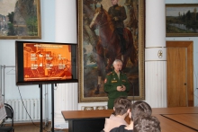 Это уже третья встреча со студентами средне-специального учебного заведения в рамках депутатского проекта «Вклад Урала в Победу». В целом, в 2024 году на подобные мероприятия приглашались студенты Свердловского областного педагогического колледжа, Свердловского областного медицинского колледжа. Перед учащимися выступил военный журналист и писатель полковник запаса Владислав Майоров. Автор проекта на конкретных фактах показал ведущую роль Урала в создании Оружия Победы, формировании боевых резервов для фронта, сохранении величайших культурных ценностей, эвакуированных из Москвы и Ленинграда, излечении тяжелораненных бойцов в госпиталях Свердловской области и о многом другом. После лекции юноши побывали в Военно-историческом зале Дома офицеров ЦВО, осмотрели его уникальные экспозиции, наполненные реликвиями военных лет. Большой интерес у них вызвала мультимедийная панорама «Форсирование Днепра в 1943 году».