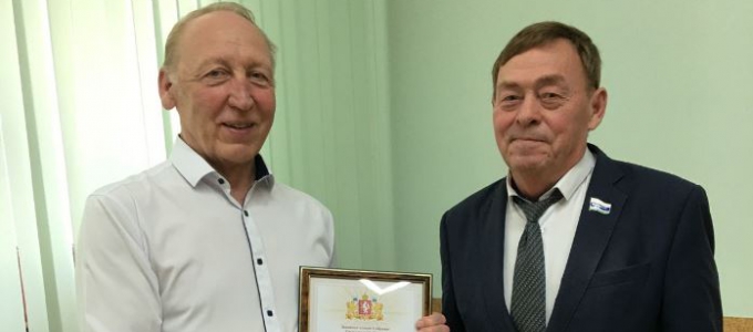 Валентин Лаппо вручил Благодарственное письмо Законодательного Собрания Свердловской области Сергею Манихину - генеральному директору одного из ведущих предприятий Железнодорожного района Екатеринбурга - «СИГНАЛ-ПАК».