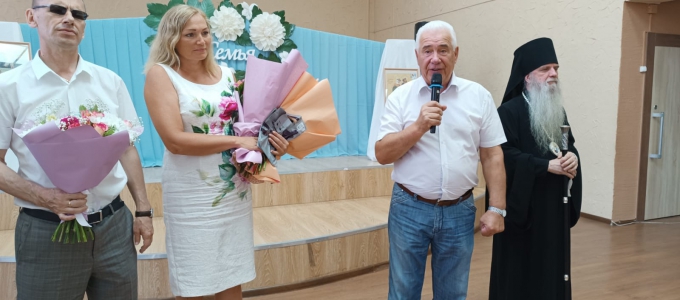 Напомнив об истории праздника Семьи, любви и верности, Виктор Якимов обратил внимание на то, что Россия и Каменск-Уральский всегда были сильны многодетными семьями, которые воспитывали физически и нравственно здоровые поколения. Заместитель председателя Законодательного Собрания пожелал счастья каменским семьям и вместе с владыкой Мефодием вручил подарки и цветы четырем супружеским парам с детьми.