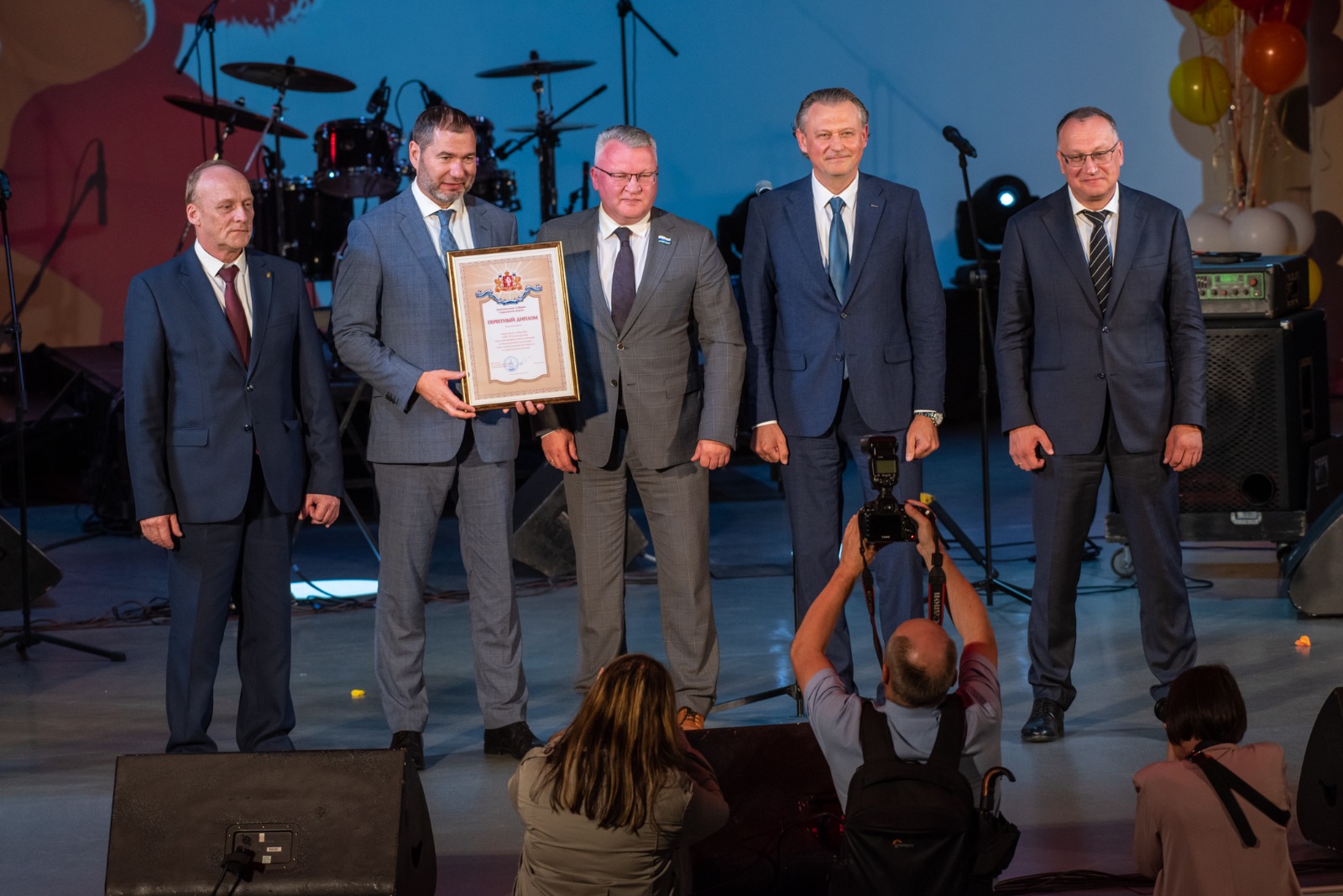 Чествование героев труда продолжилось вечером в городском Дворце культуры. Здесь же, на сцене ДК, Сергей Никонов вручил руководству ГОКа Почетный Диплом за достойный вклад в развитие горно-металлургической отрасли в Свердловской области. После церемонии награждения свой музыкальный подарок горнякам и металлургам Качканара подарили солисты группы «Дюна».