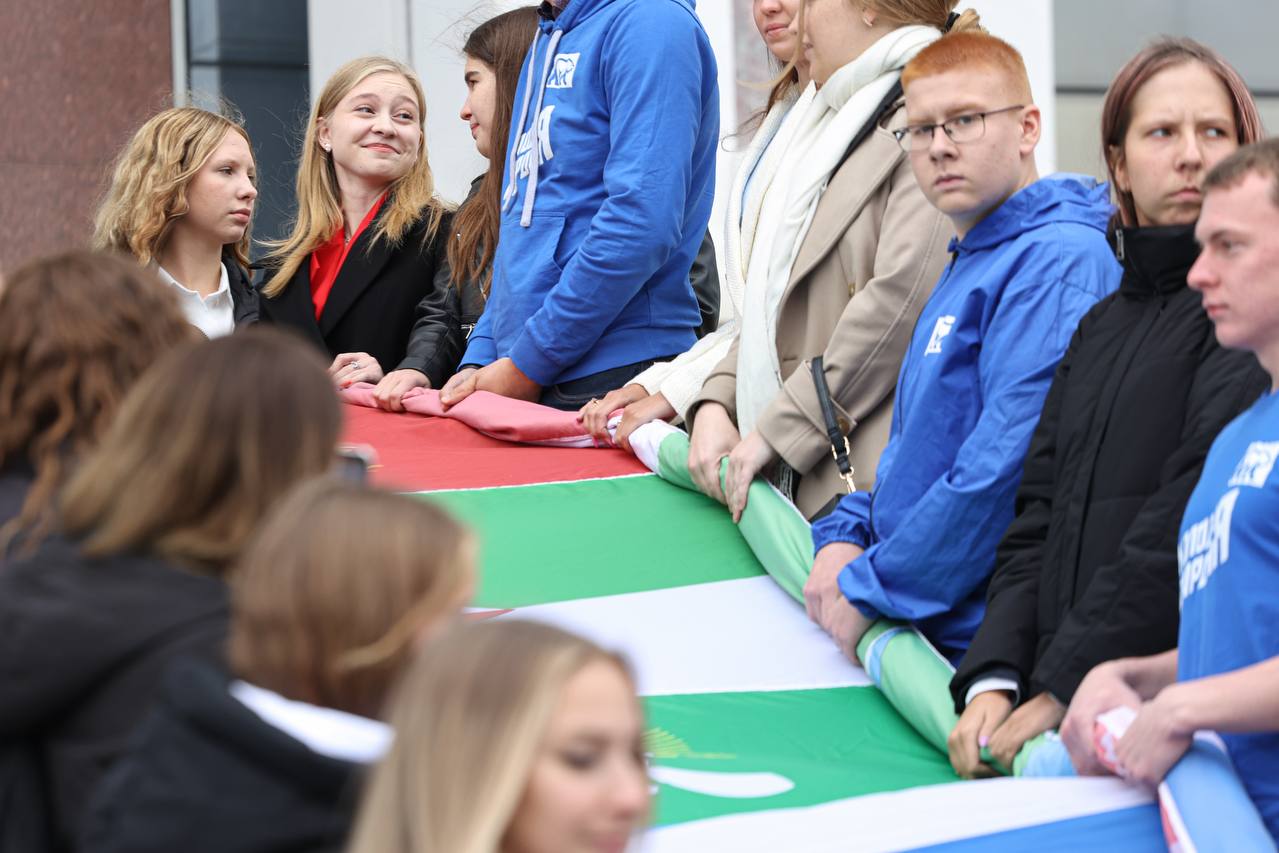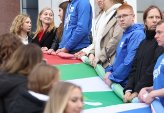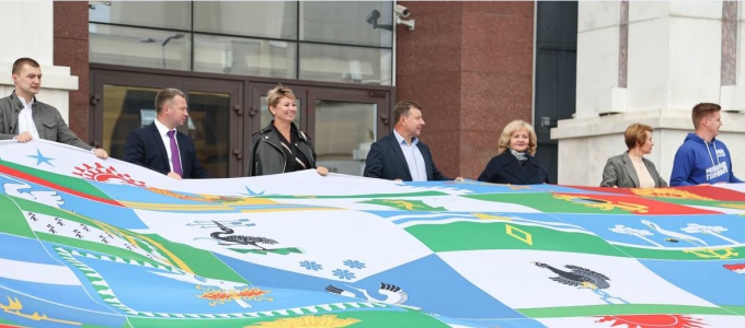 Сегодня старт проекта «Молодёжная перспектива региона» был отмечен ярким акцентом – в завершение торжественной встречи её участники провели флэшмоб – развернули у входа в Законодательное Собрание полотно с изображением флагов всех муниципальных образований Свердловской области.