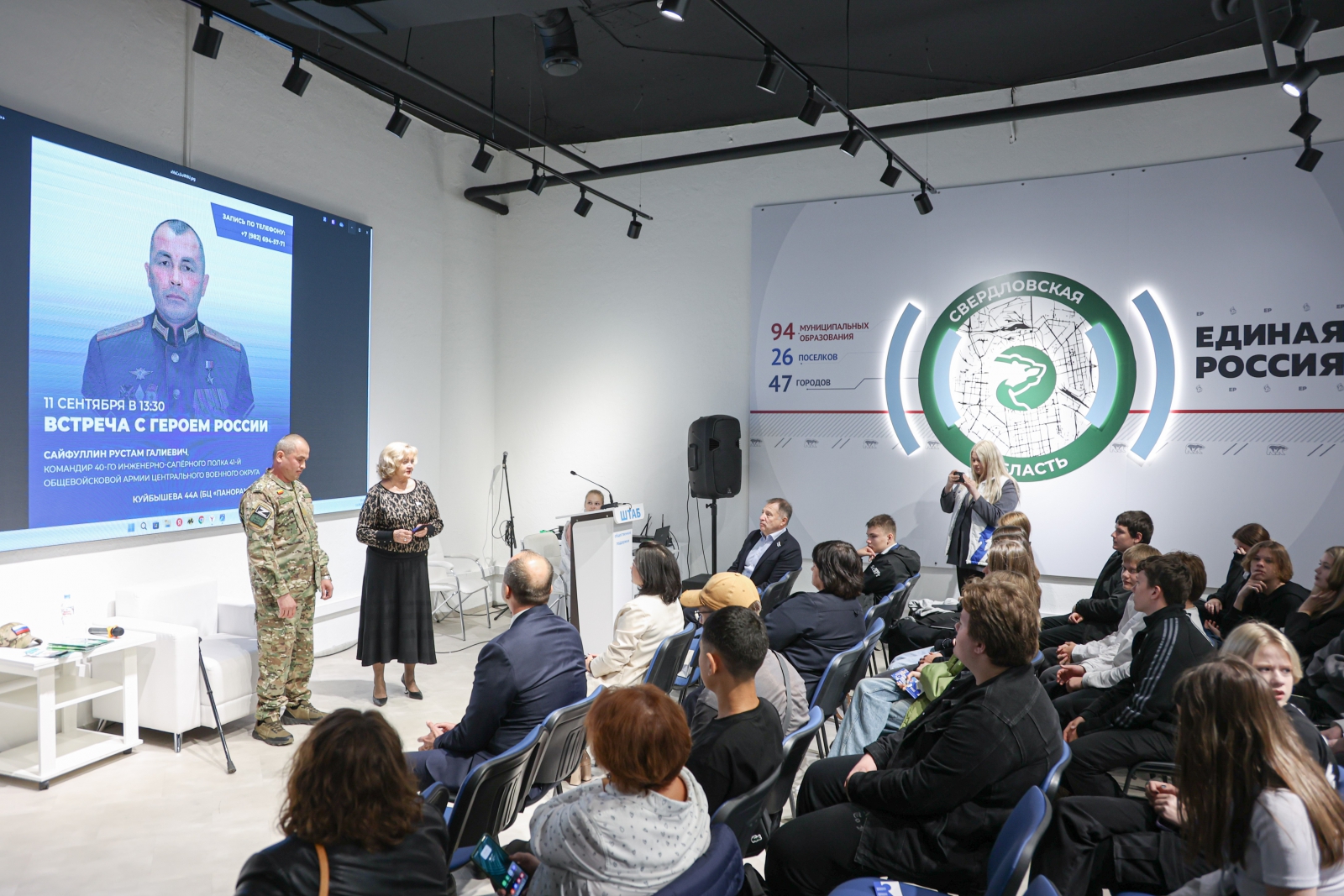 Председатель Законодательного Собрания Свердловской области Людмила Бабушкина приняла участие во встрече с Героем Российской Федерации, полковником Рустамом Сайфуллиным. Мероприятие состоялось в Штабе общественной поддержки свердловского отделения партии «Единая Россия». Пообщаться с офицером, совершившим подвиги в ходе специальной военной операции, решили многие екатеринбуржцы.