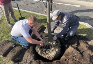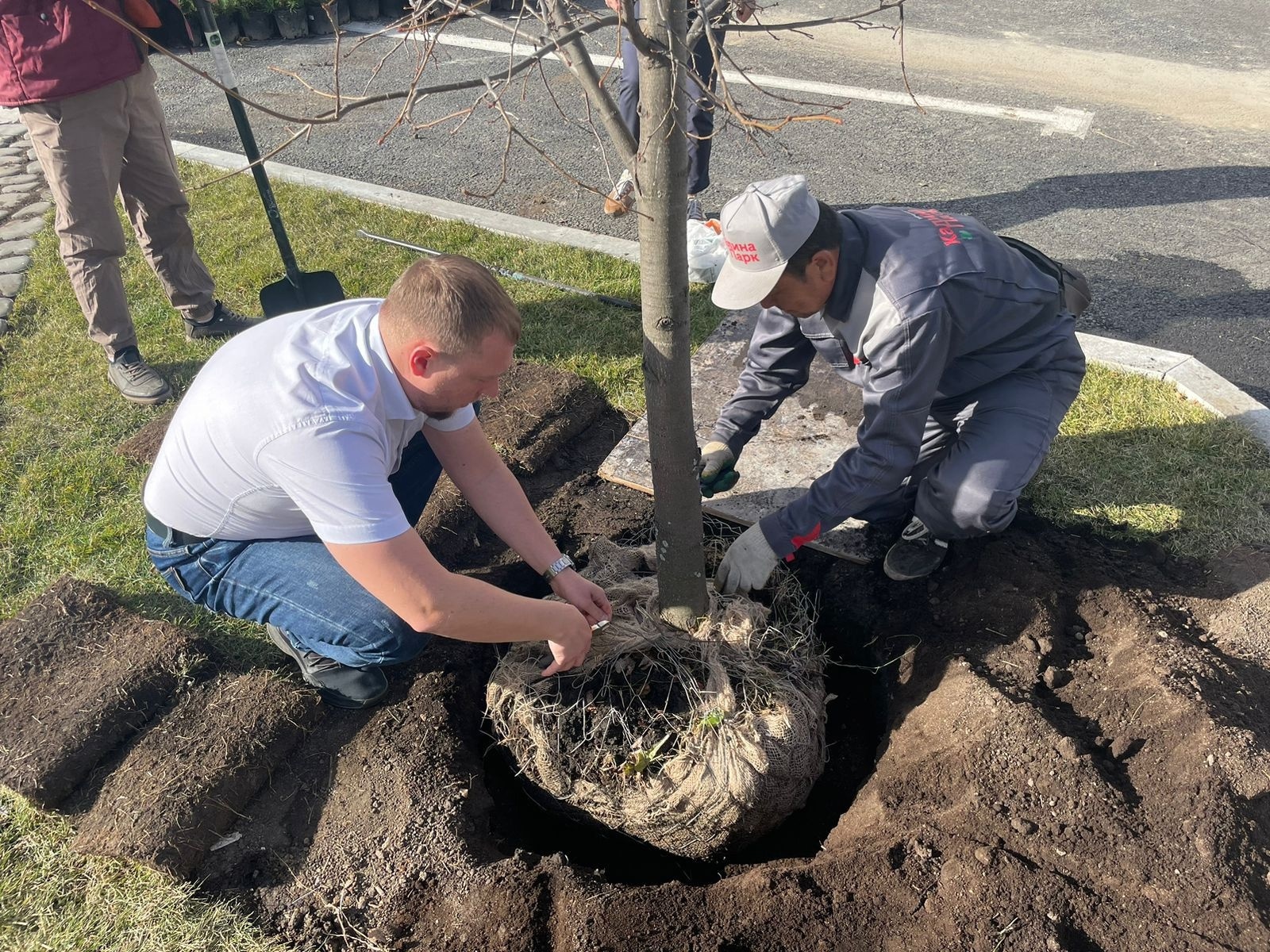 Завершается благоустройство территории Детской городской больницы №15. Владимир Смирнов внёс вклад в озеленение и посадил липу.
