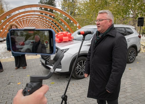 Церемония вручения семиместной машины Виталию Владимировичу и Анастасии Владимировне Грищеня, воспитывающим 13 детей в возрасте от 2 лет до 21 года, состоялась на Аллее Арок в Качканаре.
