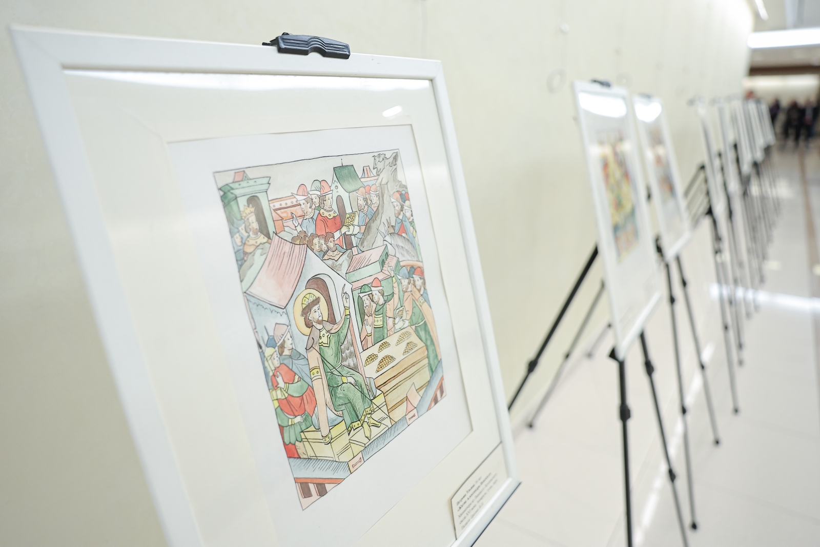 В экспозиции представлены выполненные в разные годы работы, посвящённые Преподробному Сергию Радонежскому, Благоверному князю Александру Невскому и Святому равноапостольному князю Владимиру. Возраст юных художников – от 11 до 17 лет. Работы выполнены по лицевым рукописям, украшенным миниатюрами, в технике акварель, тушь, перо. Ребята самостоятельно выбрали эпизоды российской истории, которые хотят изобразить, и сделали копии миниатюр из средневековых книг, добавив свои творческие находки.