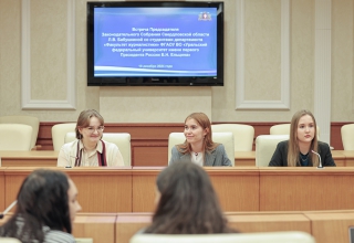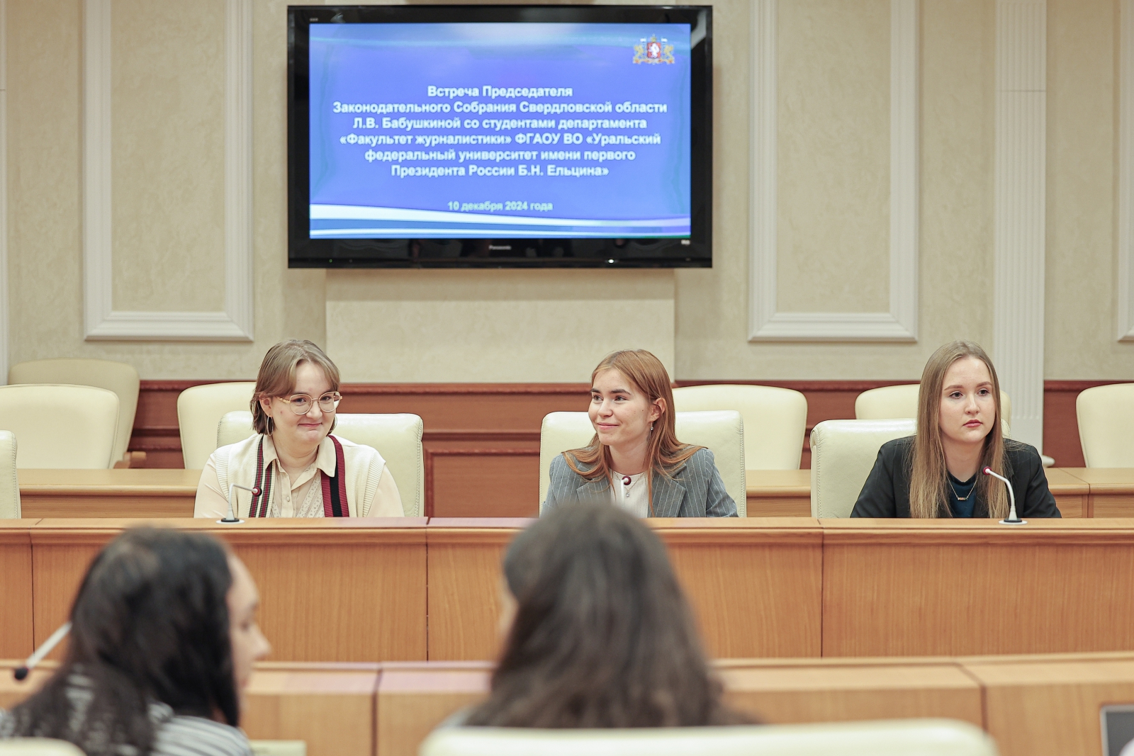 В Законодательном Собрании состоялась встреча председателя Законодательного Собрания Людмилы Бабушкиной со студентами департамента «Факультет журналистики» Уральского федерального университета имени первого Президента России Б.Н. Ельцина. Второкурсники факультета журналистики ранее обратились к председателю областного парламента с предложением подготовить серию материалов, посвящённых 30-летию законодательной власти Свердловской области. В ходе встречи Людмила Бабушкина рассказала студентам об истории регионального парламента, о становлении законодательной власти на Среднем Урале, ответила на вопросы будущих журналистов.