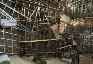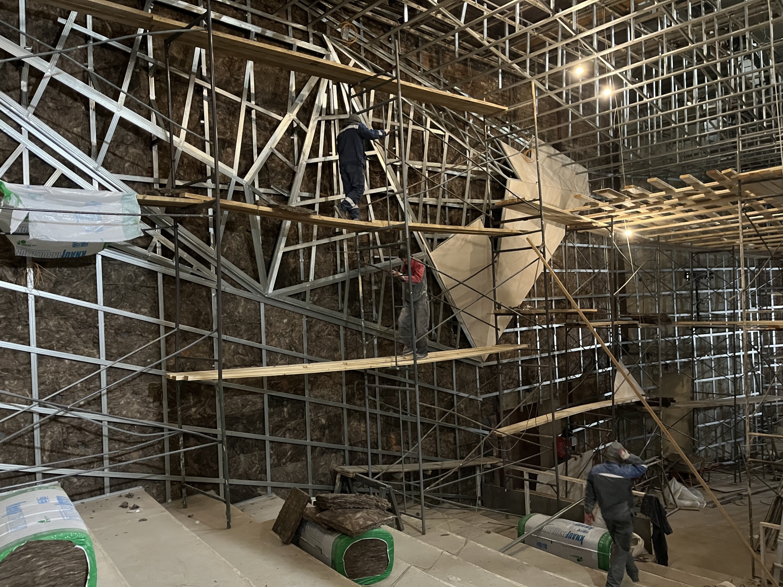 Второй контрольный объект – зрительный зал дворцы культуры «Кристалл» – утопает в строительных лесах. Здесь продолжается монтаж каркаса геометрически сложных стеновых и потолочных конструкций. Ведется установка оборудования механики сцены. Параллельно идет монтаж системы пожарной сигнализации.