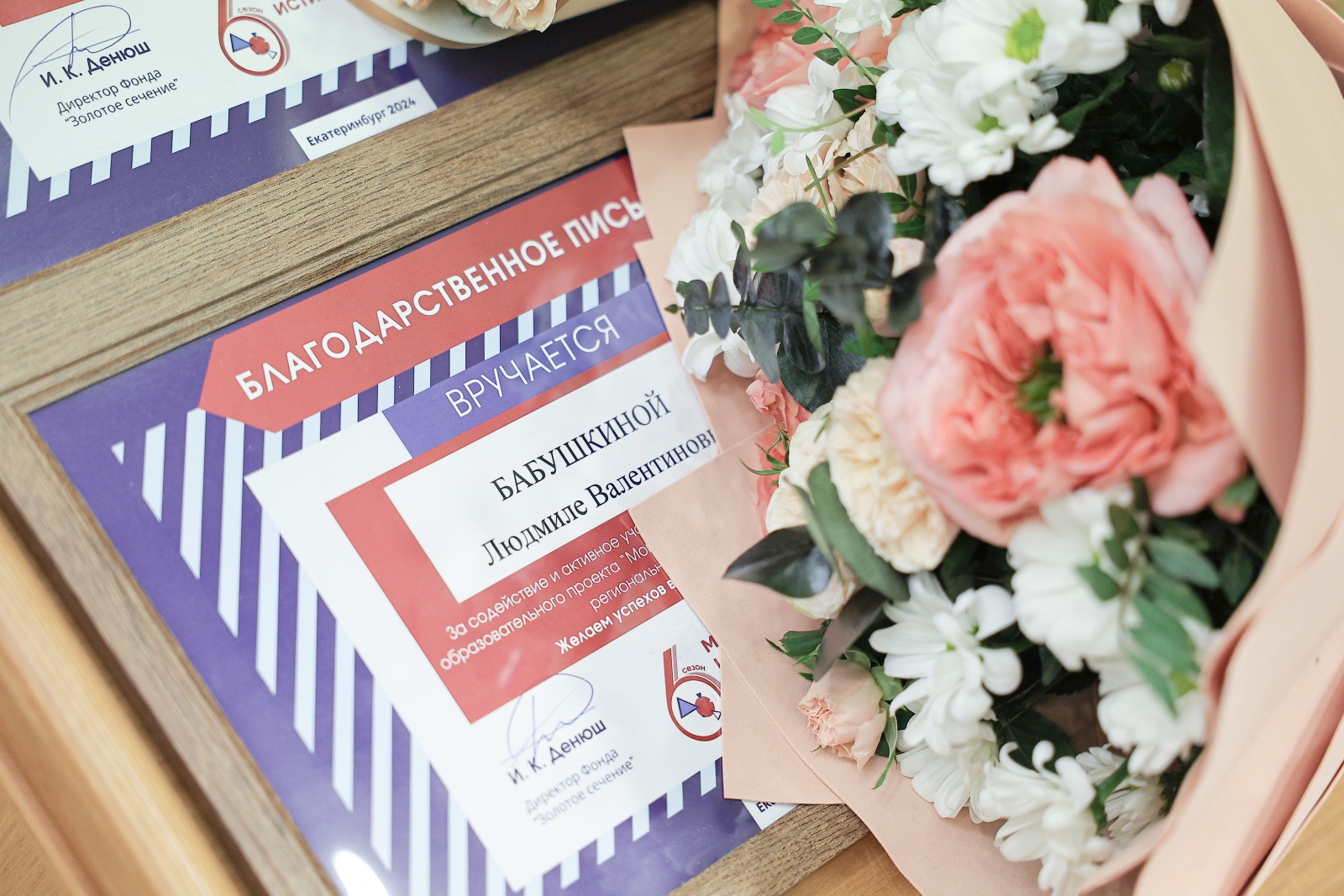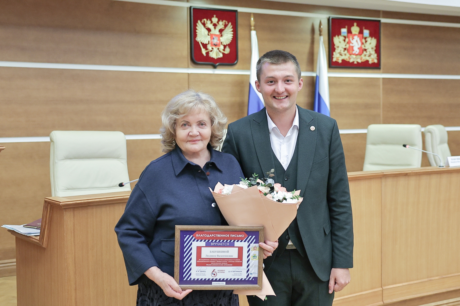 Основатель проекта «Момент истины», руководитель Центра поддержки и развития молодёжи Екатеринбурга «Город молодёжи» Дмитрий Биктимиров отметил огромный вклад Людмилы Бабушкиной в развитие конкурса. Благодарственные письма за содействие и активное участие в организации VI сезона образовательного проекта «Момент истины» были вручены Людмиле Бабушкиной и Елене Чечуновой.