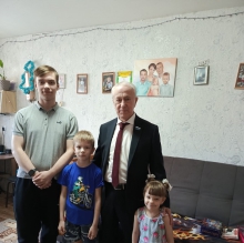 В семье трое детей. Старший ребёнок, Никита, учится в колледже, средний по возрасту Иван - будущий первоклассник, а самая маленькая Варвара ещё играет в куклы. Состоялся разговор с мамой о воспитании детей в многодетной семье, их дальнейшем обучении. Вячеслав Погудин вручил детям подарки.