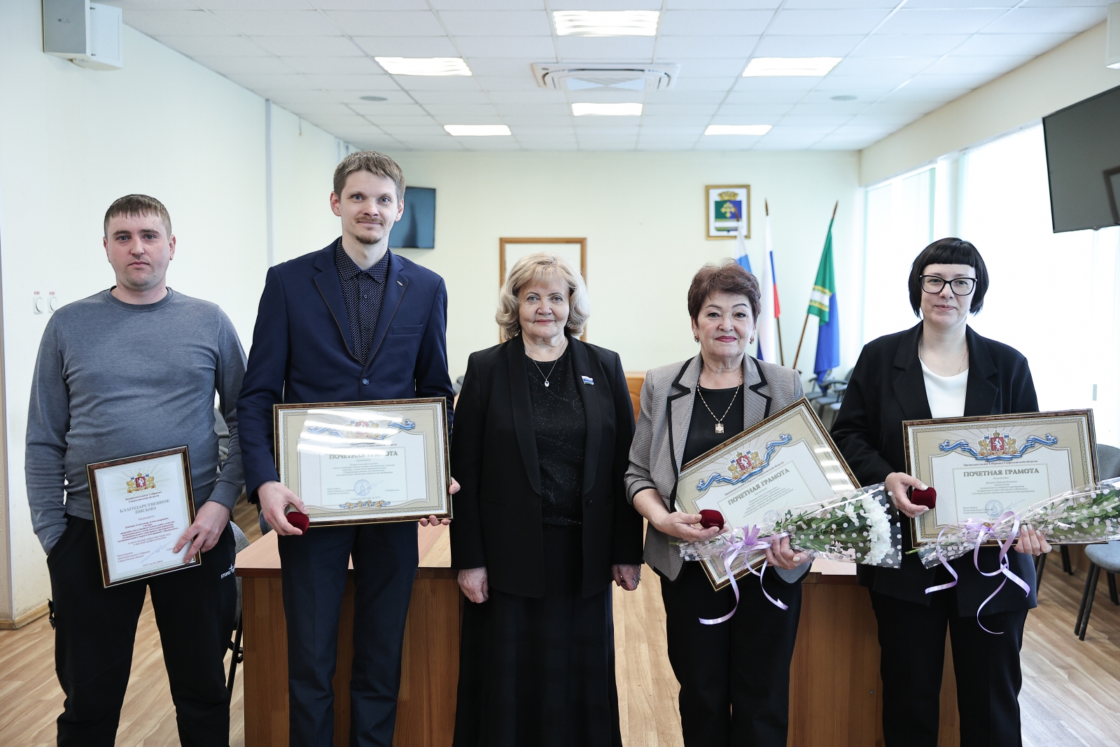 Из рук председателя областного парламента почётные грамоты получили: техник-смотритель отдела жилищно-коммунального хозяйства ООО УК «Богдановичская» Александр Поляков, специалист по работе с абонентами ООО УК «Веста» Наталья Квашнина, юрисконсульт МУП МО «Богданович «Водоканал» Наталья Трясцына, благодарственное письмо – слесарь аварийно-восстановительных работ 5 разряда цеха водоснабжения участка водопроводных сетей МУП МО Богданович «Водоканал» Александр Швецов.