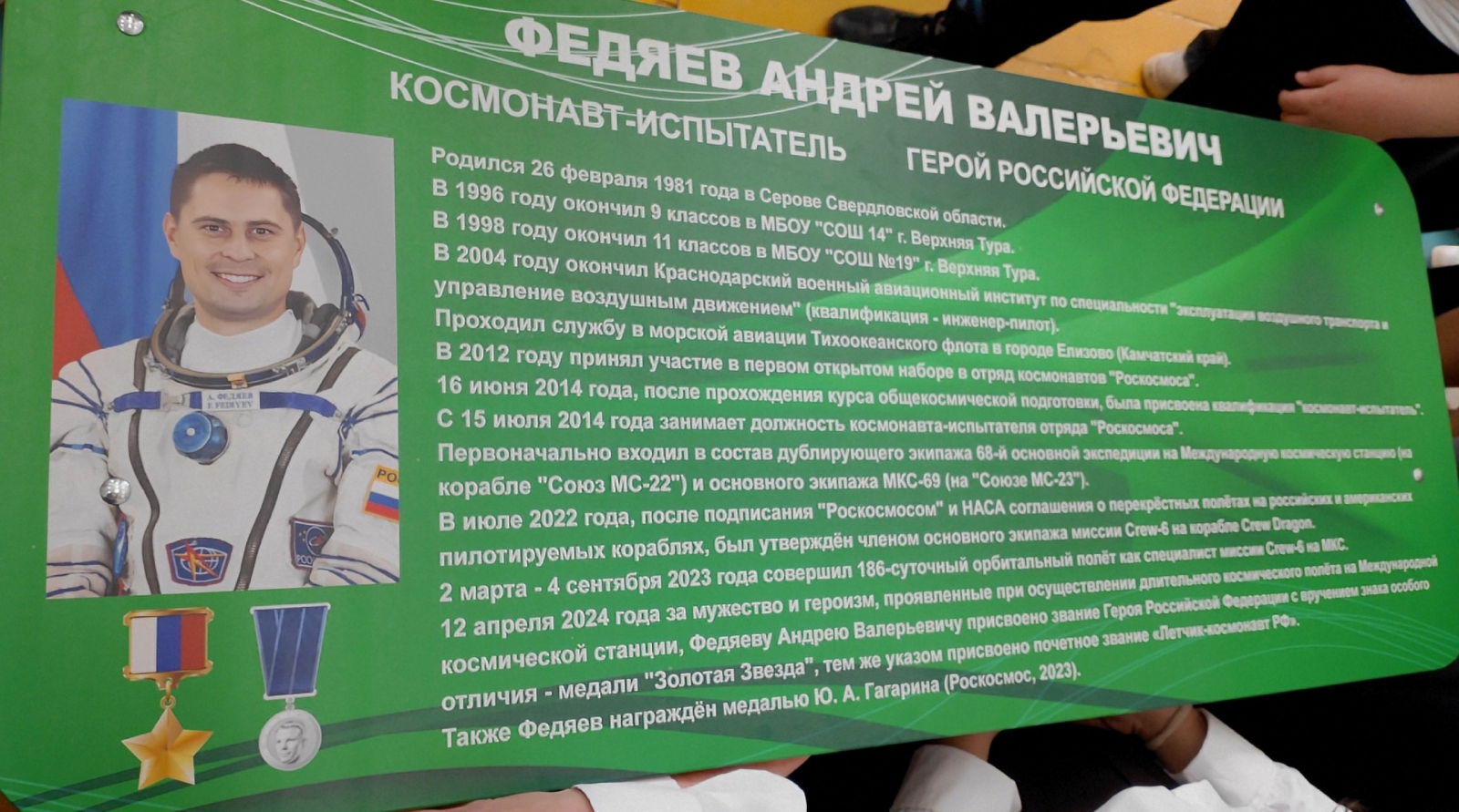 «Инициатива реализовать в стенах школы этот всероссийский образовательный проект принадлежит педагогическому коллективу, – отметил депутат Законодательного Собрания Свердловской области Сергей Никонов. – Будущий лётчик-космонавт учился в этой школе с первого по девятый класс. Здесь и сегодня работает немало учителей, кто лично учил Андрея Федяева, кто следит за его профессиональной деятельностью, кто гордится успехами своего ученика».