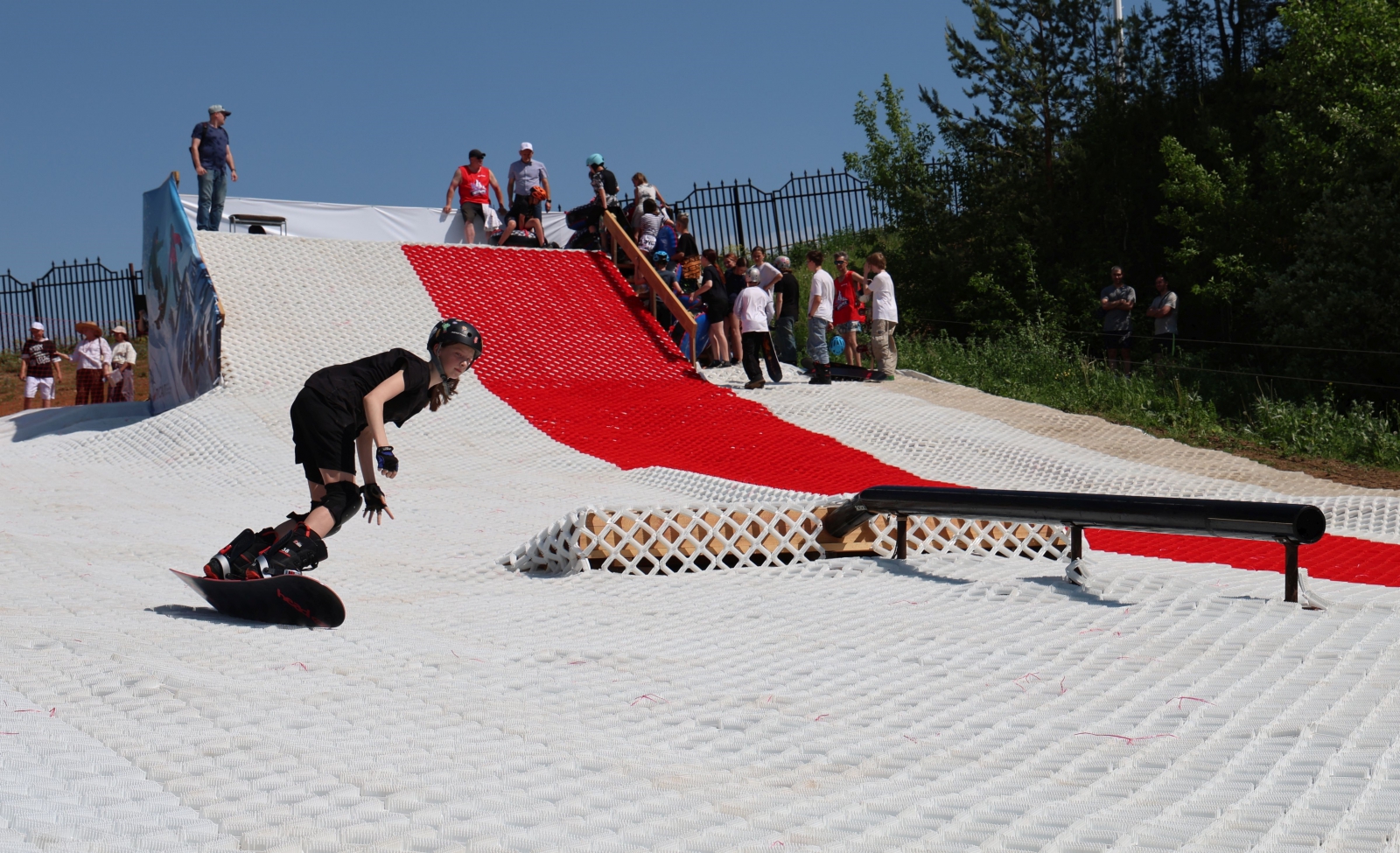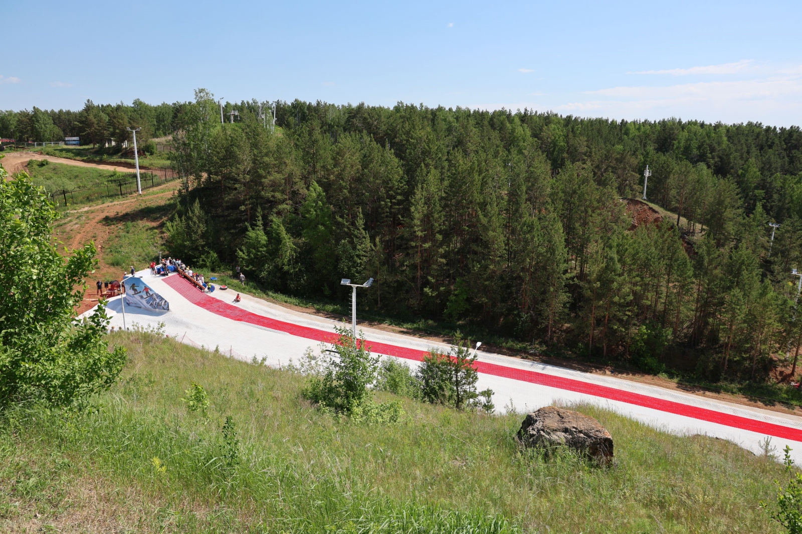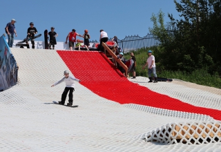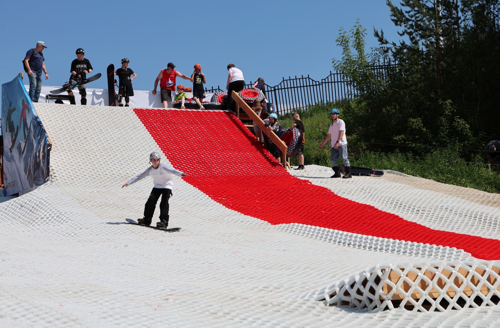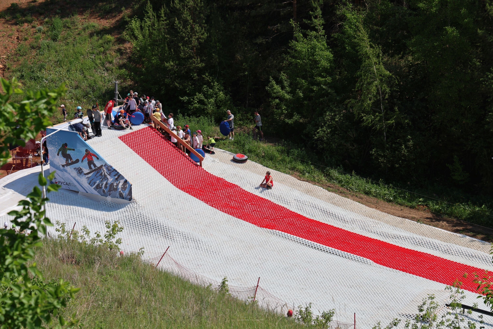 Горку площадью более тысячи квадратных метров покрыли инновационным материалом snowplast. «Пластиковый снег» полностью имитирует свойства настоящего снега. Полотно трассы разделено на две зоны. Одна полоса оборудована для скейтбордистов и сноубордистов: здесь установлены рейлы и специальные конструкции для джиббинга. Вторая полоса предназначена для любителей покататься с горы на «ватрушках» и «бубликах».