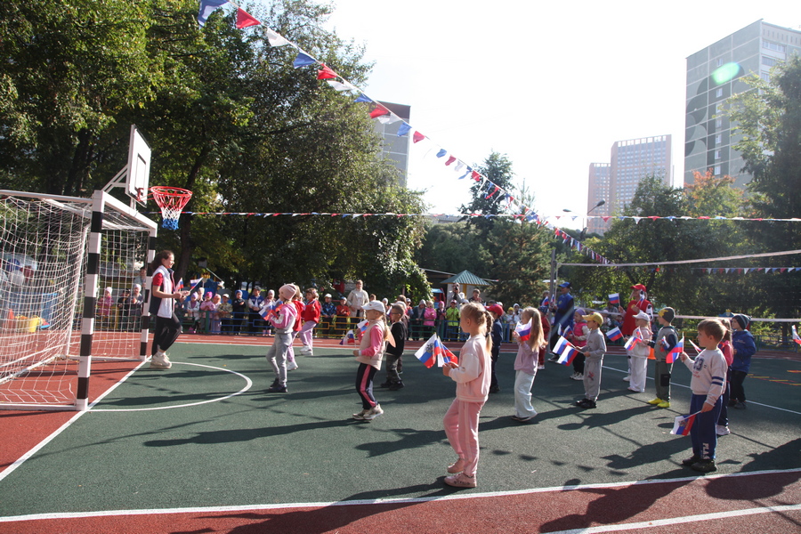 На многофункциональной спортивной площадке со специальным покрытием дети могут заниматься бегом, играть в футбол, волейбол, баскетбол и другие спортивные игры. У ребят появились тренажёры, теннисные столы, гимнастическая скамья. Для коллектива детского сада и родителей открытие детского спортивного комплекса стало настоящим прорывом. Это уже новый уровень физической закалки дошколят. В честь такого радостного события педагоги и детишки подготовили спортивный праздник.