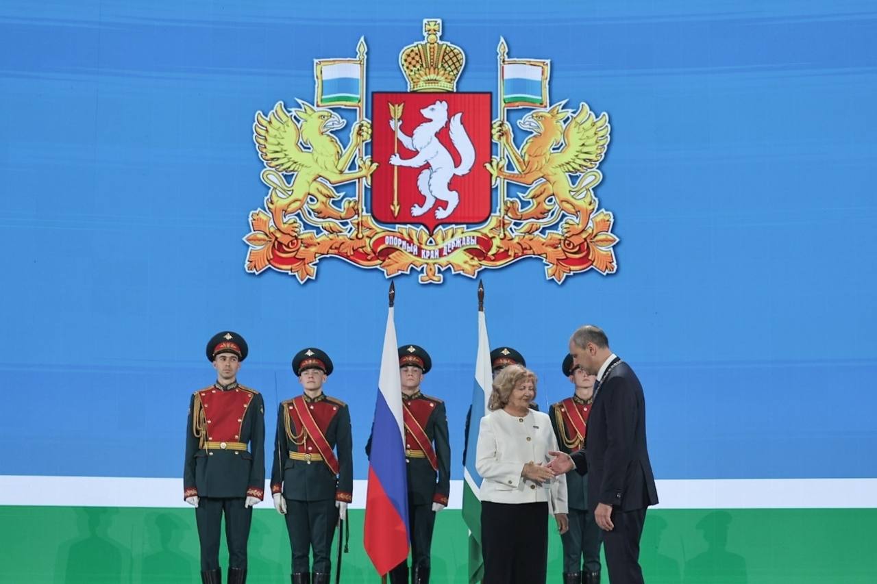 Людмила Бабушкина в присутствии сенаторов РФ, депутатов, глав регионов УрФО, глав муниципалитетов, почётных граждан Свердловской области, руководителей предприятий, представителей религиозных конфессий, общественности и средств массовой информации обратилась к Денису Паслеру с просьбой принести присягу и передала знак губернатора Свердловской области.