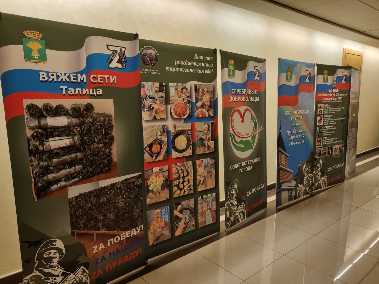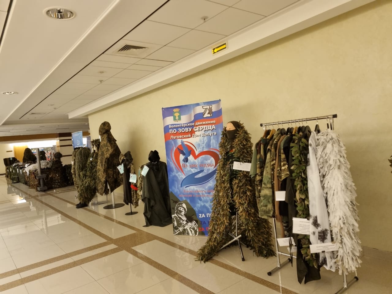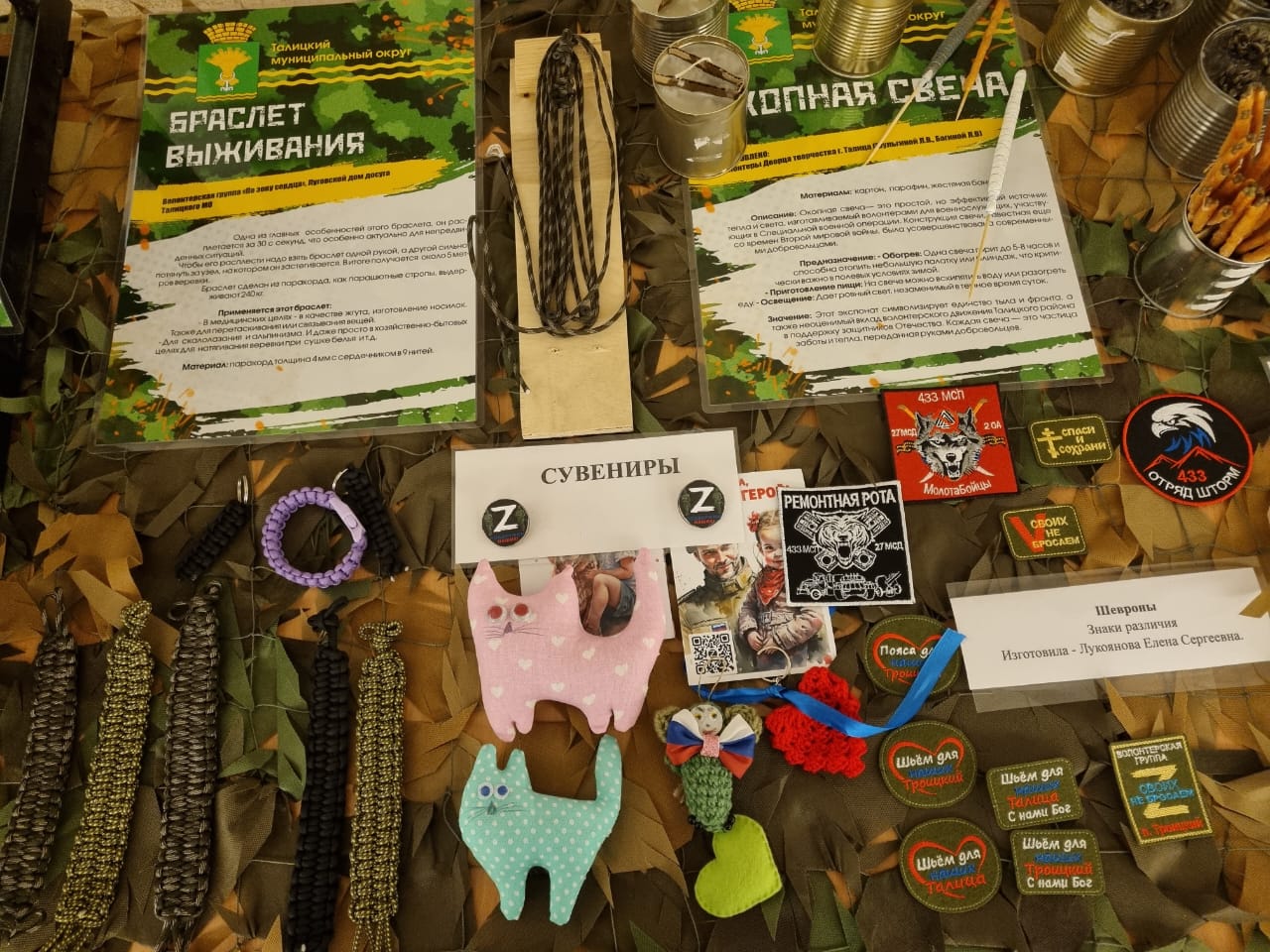 На выставке представлены изделия, изготовленных волонтёрами для участников специальной военной операции.